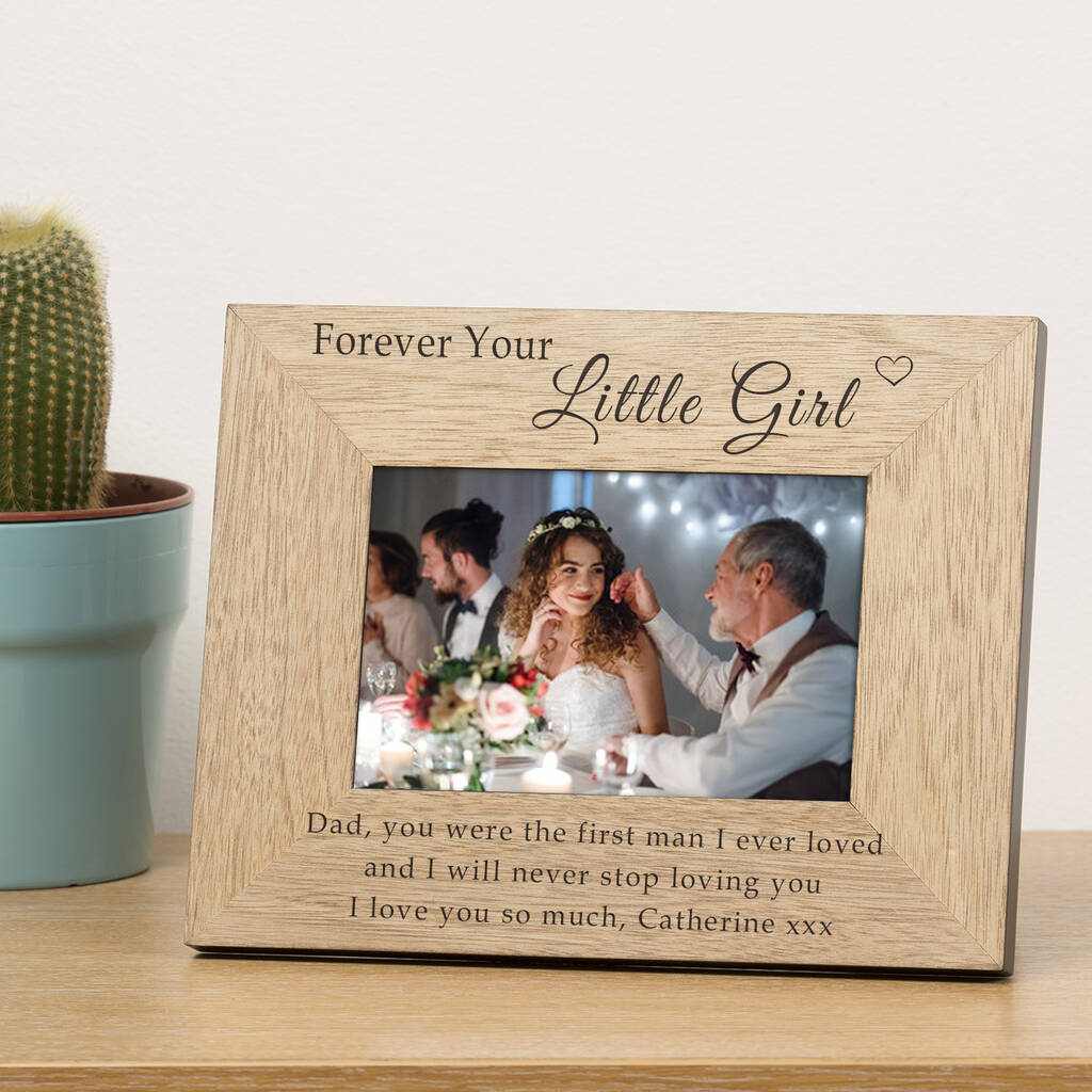 A high quality finish oak veneer wood frame. The top is engraved ""Forever Your Little Girl"". The bottom of the frame is left free for your own personalised message. The frame holds a 6x4 photograph (outer dimensions are 220mm x 170mm). Available in portrait or landscape.