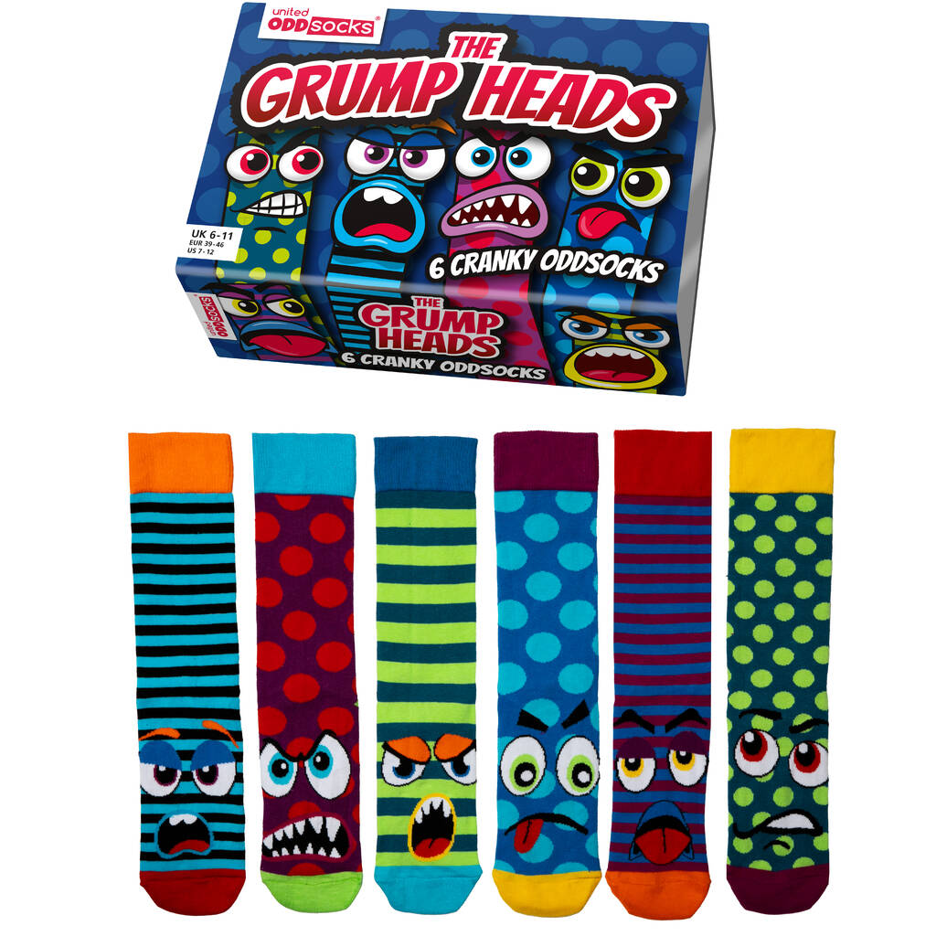 Release the Grump with Style: These quirky calf-length Grump Heads oddsocks are here to lighten your mood and lift your outfit.Gift-Boxed with Attitude: Packed in a brightly illustrated box featuring the full grumpy gang, Grump Heads make the perfect gift for birthdays, holidays, or just to make someone smile. Whether it’s a quirky surprise for dad or a fun stocking filler, this set is ready to deliver laughter, colour, and monster-level moodiness in every step. Sized for Daily Rants: Designed to fit UK 6–11, EUR 39–46, and US 7–12, these mid-calf socks provide a snug and secure fit without slipping.