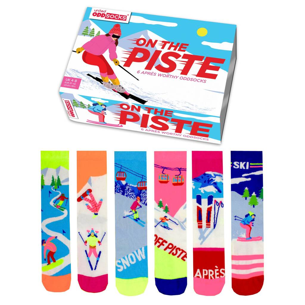 Unique Ski-Themed Designs: Celebrate your love for winter sports with United Oddsocks' On The Piste collection! Perfect Gift for Ski Lovers: Surprise the skiers and snow enthusiasts in your life with this unique and thoughtful gift! With six fun designs inspired by alpine adventures, these socks come beautifully packaged, making them perfect for birthdays, Christmas, or special occasions. They offer a fun way to share warmth, humor, and style with friends and family.