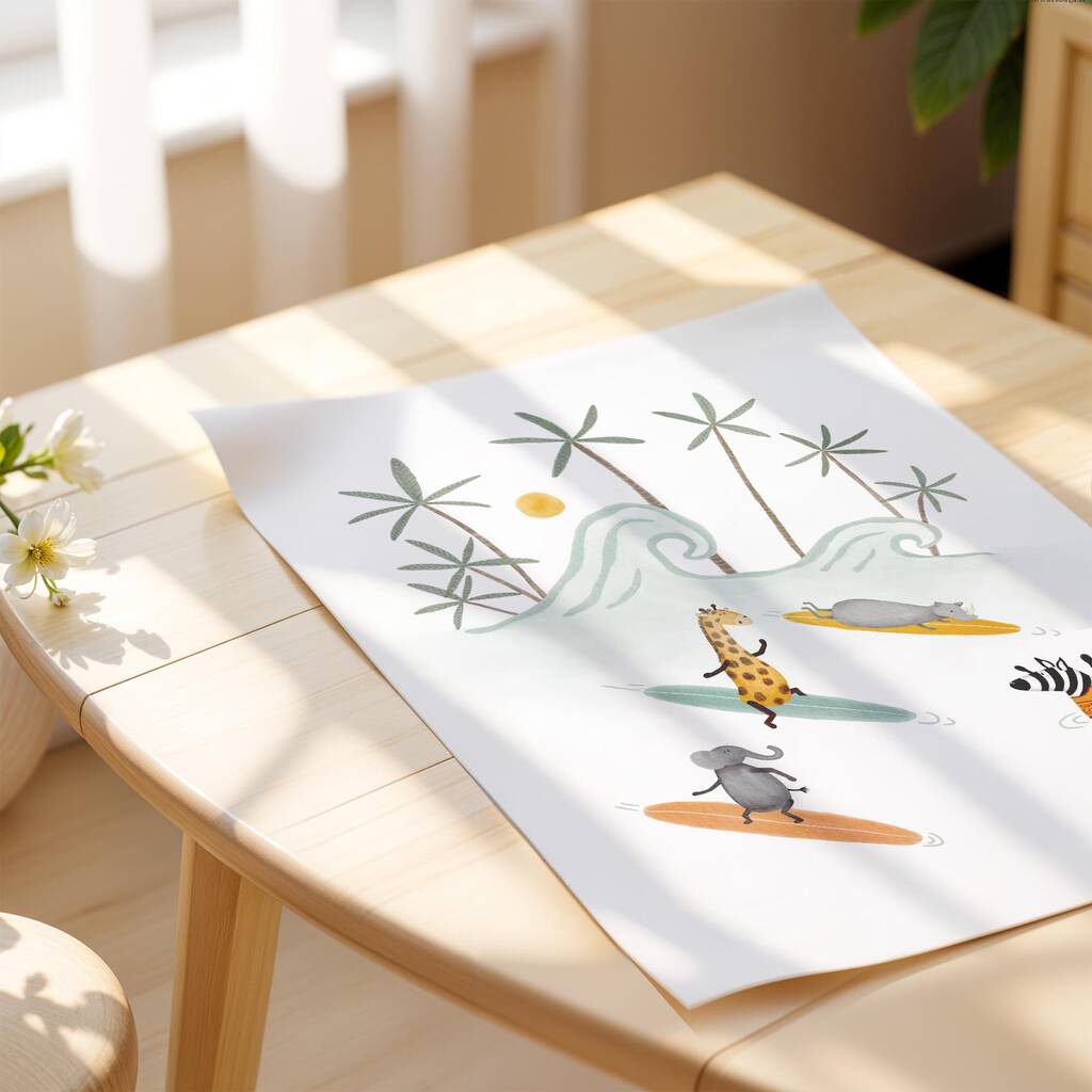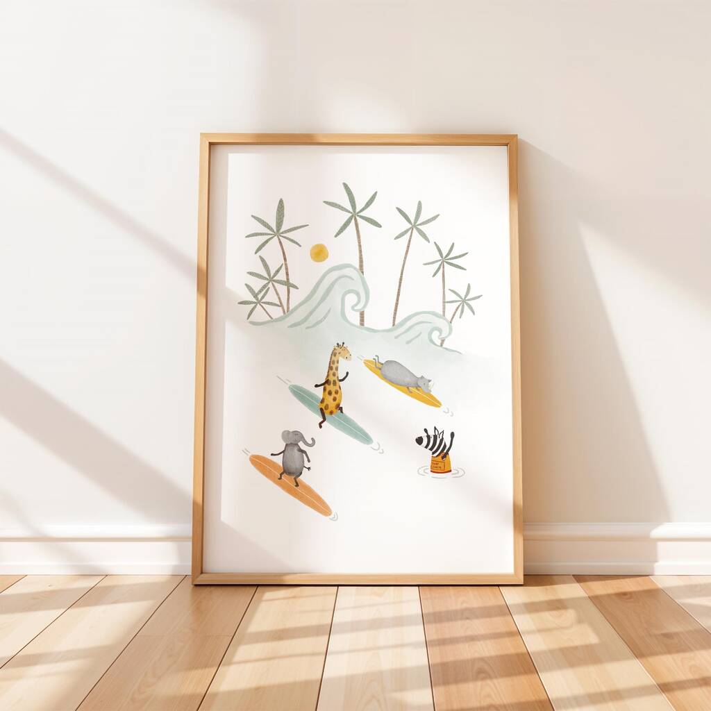 Bring a splash of sunshine and a wave of fun to your little one’s room with this whimsical Safari Surf Crew print.