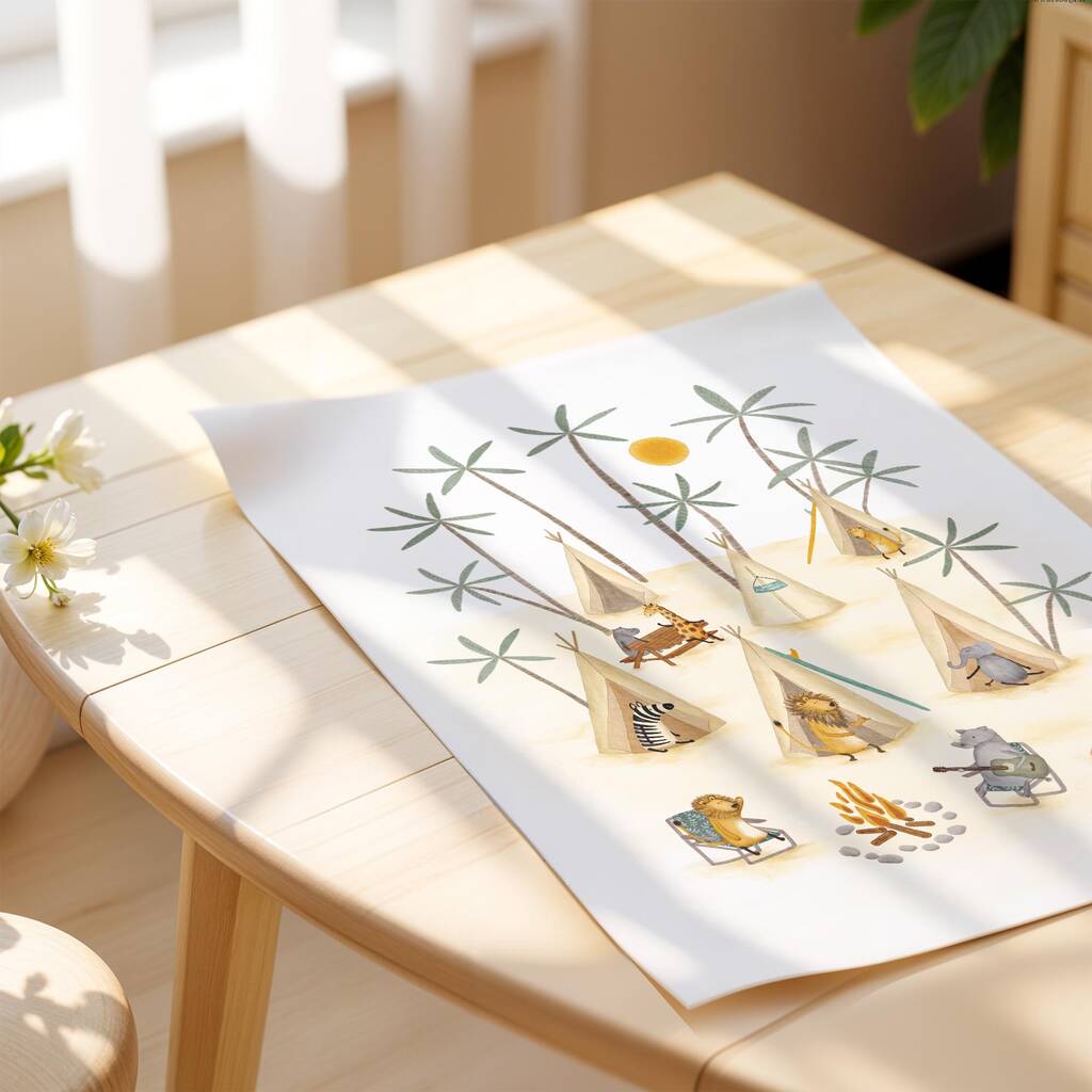 Inspired by the magic of a shared campsite after a day on the waves, this detailed print is a celebration of friendship. Discover all the charming details, from the cozy teepees nestled under the palms to the lions playing guitar by the campfire. The warm, sun-kissed colour palette and happy, relaxed vibe bring the spirit of a coastal adventure into your home. It’s the perfect piece for a child’s room or nursery, inspiring dreams of music, campfires, and friends.