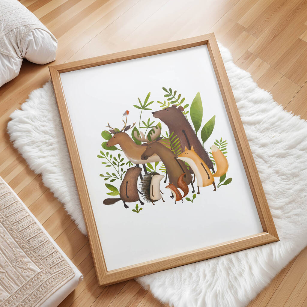 Gather the whole woodland team with this charming art print. Featuring a friendly bear, deer, fox, hedgehog, and beaver all posing together, this piece is a beautiful celebration of friendship and community. Hand-painted in a warm, whimsical style with lush green foliage, it brings the cheerful spirit of the forest into your home. It’s a wonderful focal point for a gender-neutral nursery or playroom, reminding your little one that adventures are always better when you're together.