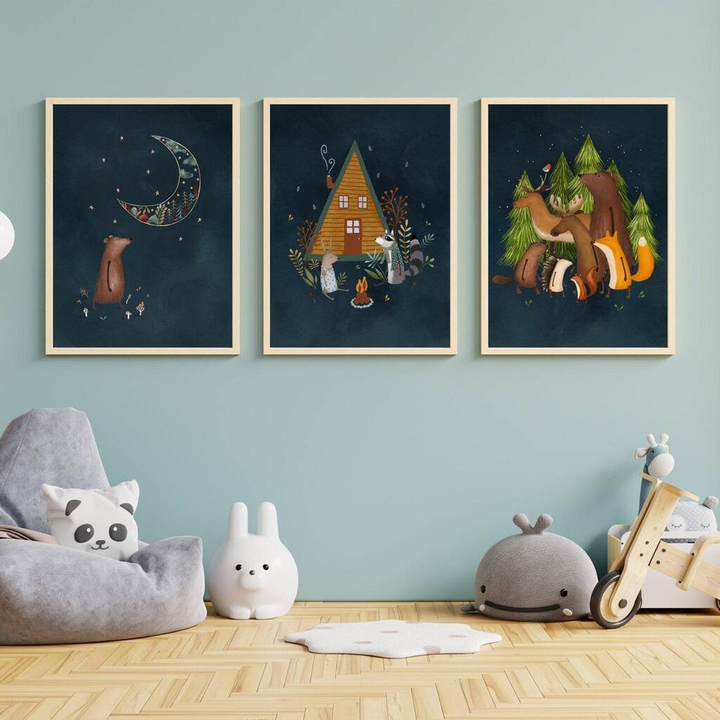 Woodland Nursery Prints – Forest Animals And Cabin Wall Art Set, Night Sky Kids Room Decor