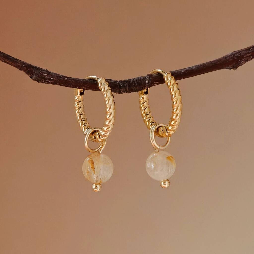 Round Gold Rutilated Quartz Twisted Hoop Earrings