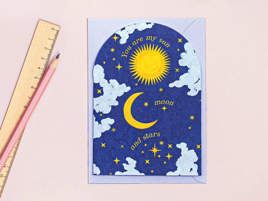 This card features hand painted illustration reading "You are my sun, moon & stars." This card is gender neutral so it's and perfect for all lovers.