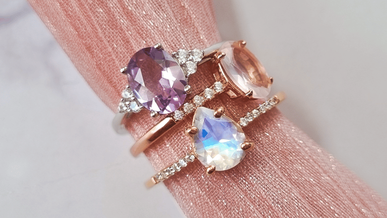 These features showcases many of our best-selling pieces such as the Pastel Gemstone Ring, Lavender Amethyst Ring, Blue Sapphire Ring, Pink Sapphire and Pink Amethyst Eternity Band, Ombre Blue Topaz Ring, Rainbow Moonstone Ring and Rose Quartz Ring.