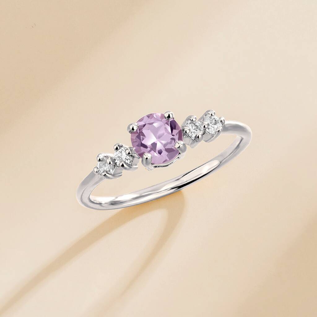 Beautiful, dainty and stackable, this stunning five-stone ring is handcrafted with natural lavender - a pastel purple gemstone and adorned with sparkly simulated diamond.