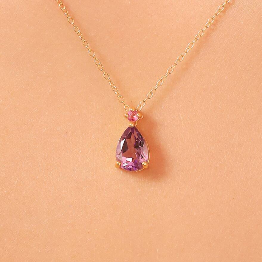 Pink Ruby And Amethyst Pear Cut Pendant Necklace In Sterling Silver And Gold Vermeil