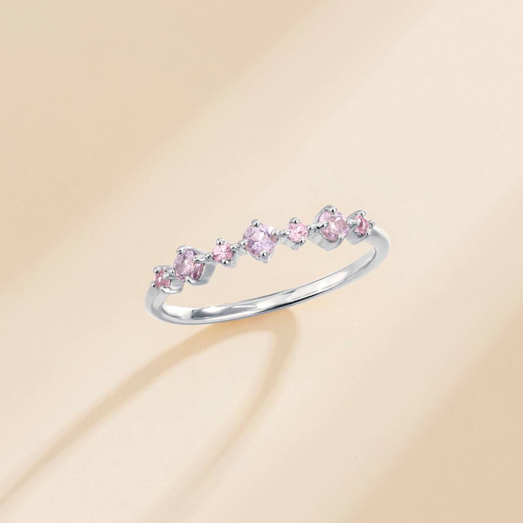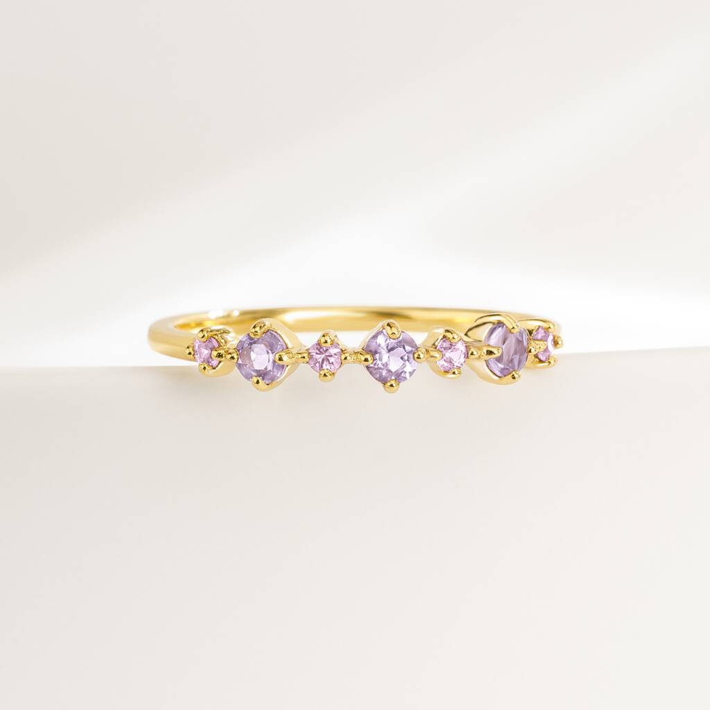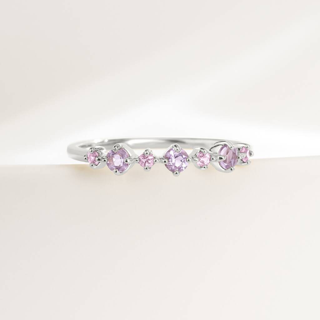 Featuring beautiful natural pink sapphires and natural lavender amethysts, tthis dainty, stackable ring is perfect for your everyday.