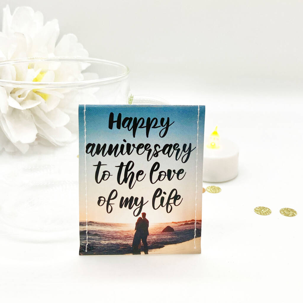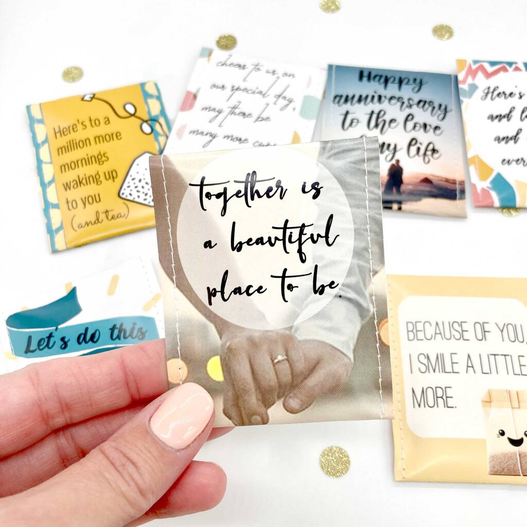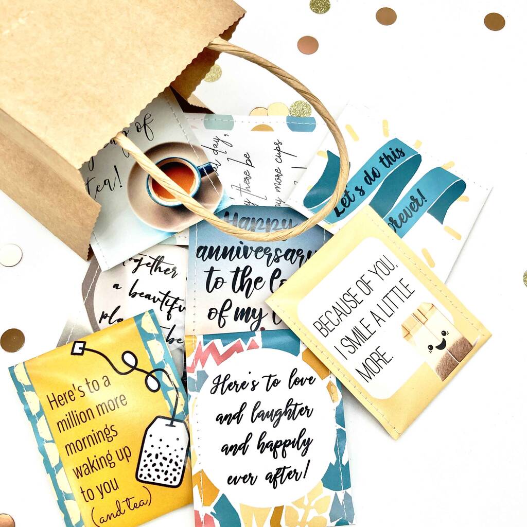 This thoughtful anniversary gift includes 8 teabags wrapped in handcrafted, sewn paper envelopes with fun quotes and heartwarming images to celebrate another year together!
