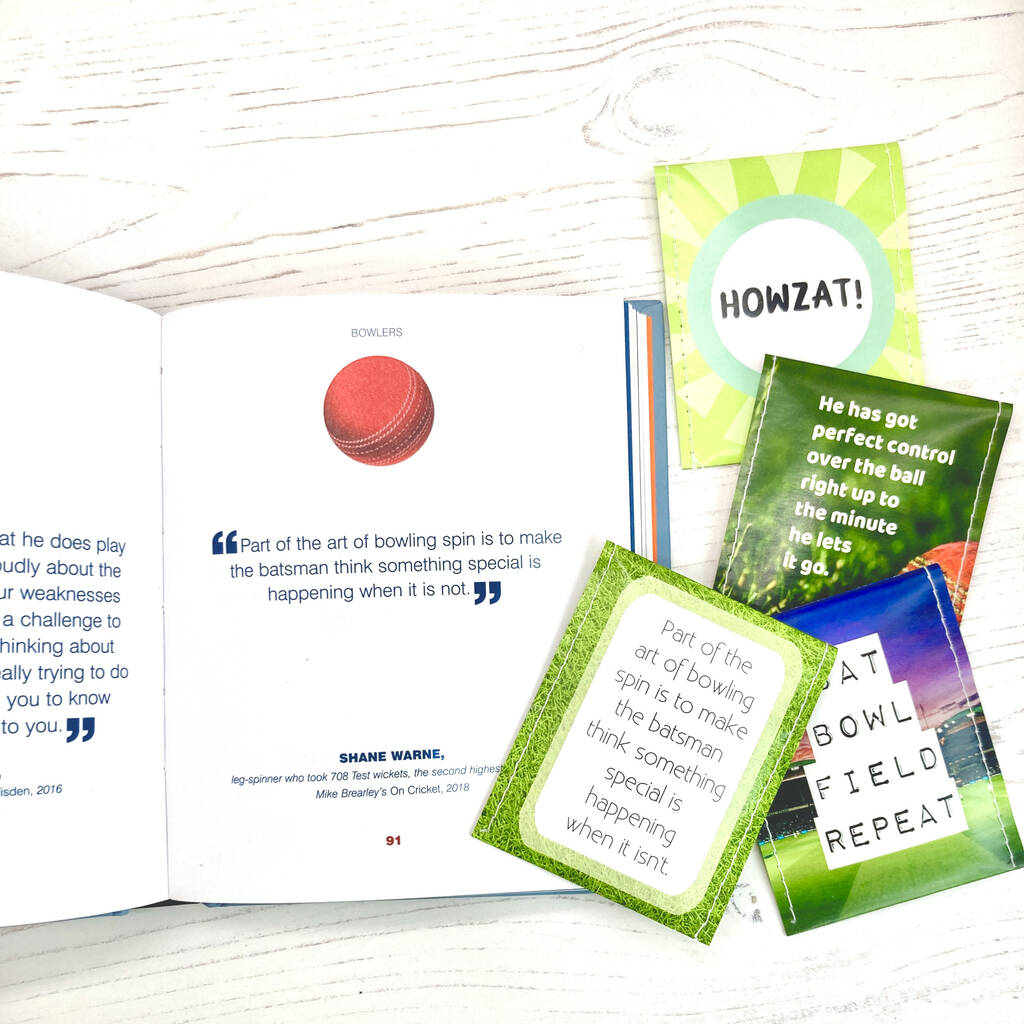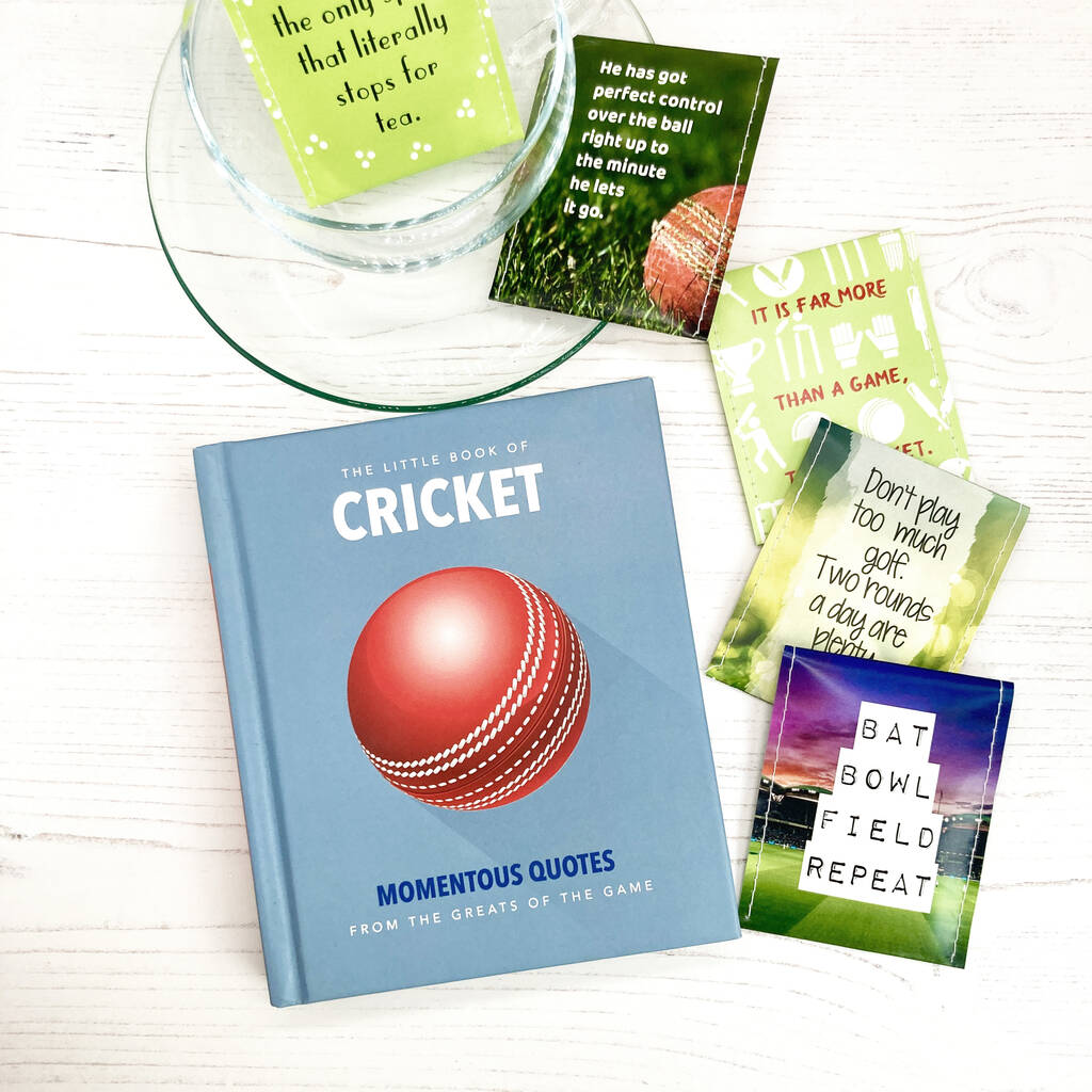 The perfect gift for cricket enthusiast: a set of 8 teabags individually packaged in handcrafted sewn paper envelopes, alongside 'The Little Book of Cricket'!