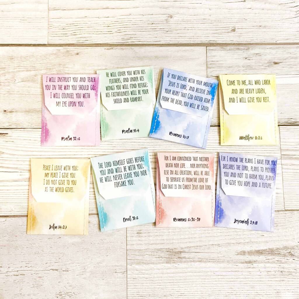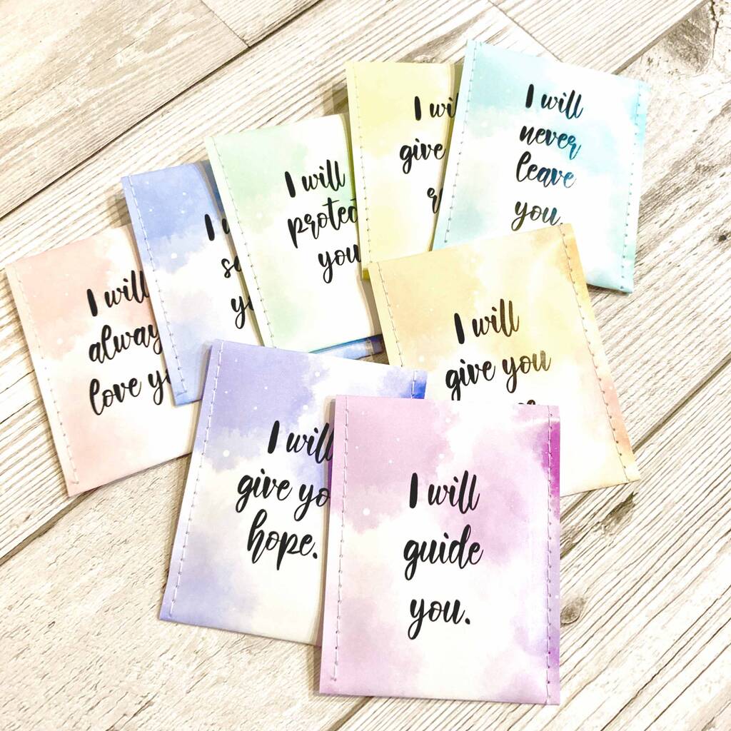 This set includes 8 teabags, each wrapped in hand-sewn paper envelopes featuring soft, watercolour patterns and uplifting Bible verses about God's Promises to us.