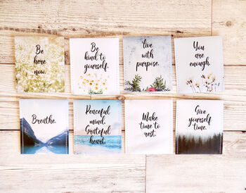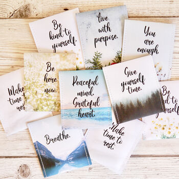 Each envelope features a calming mantra or thoughtful affirmation – designed to encourage moments of peace, presence and reflection with each cup.
