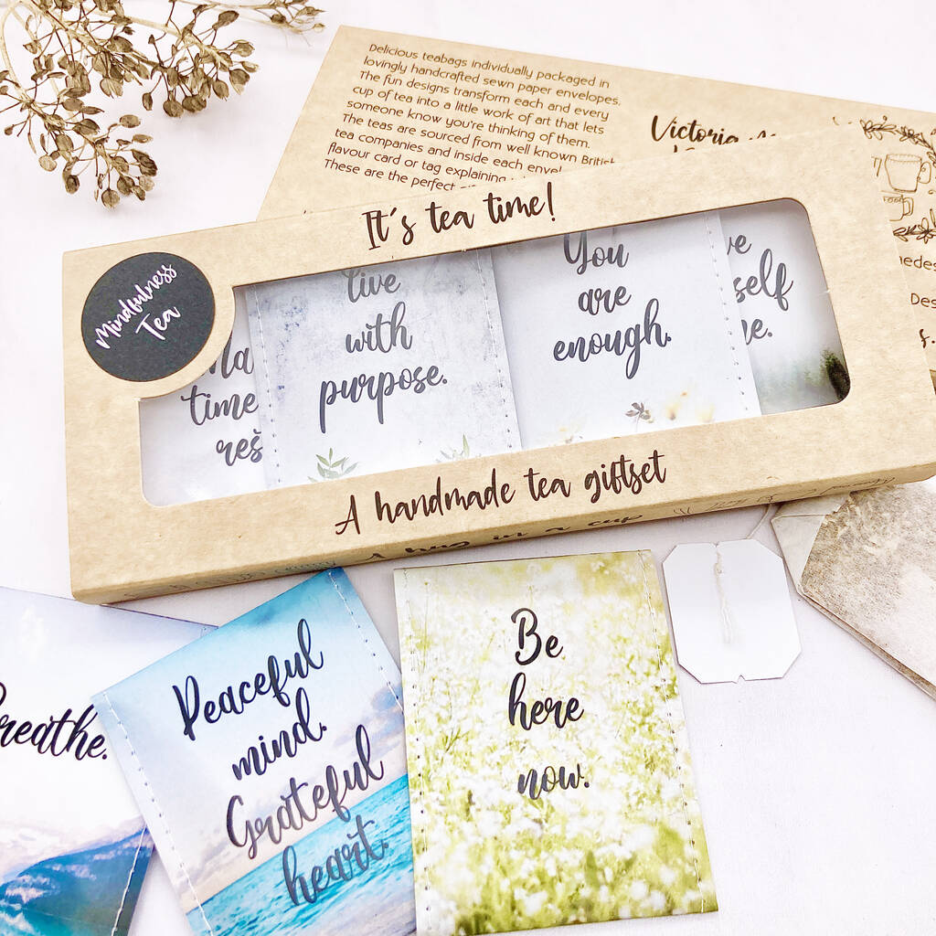 This beautiful mindfulness tea gift set includes 8 teabags, each individually wrapped in lovingly handcrafted sewn paper envelopes.