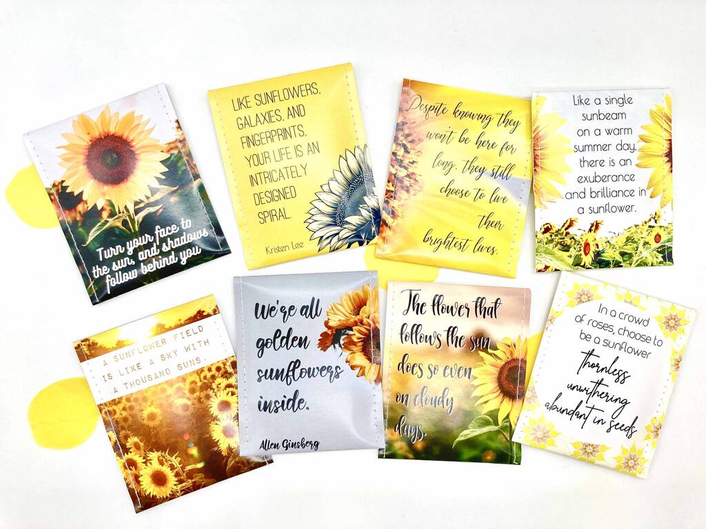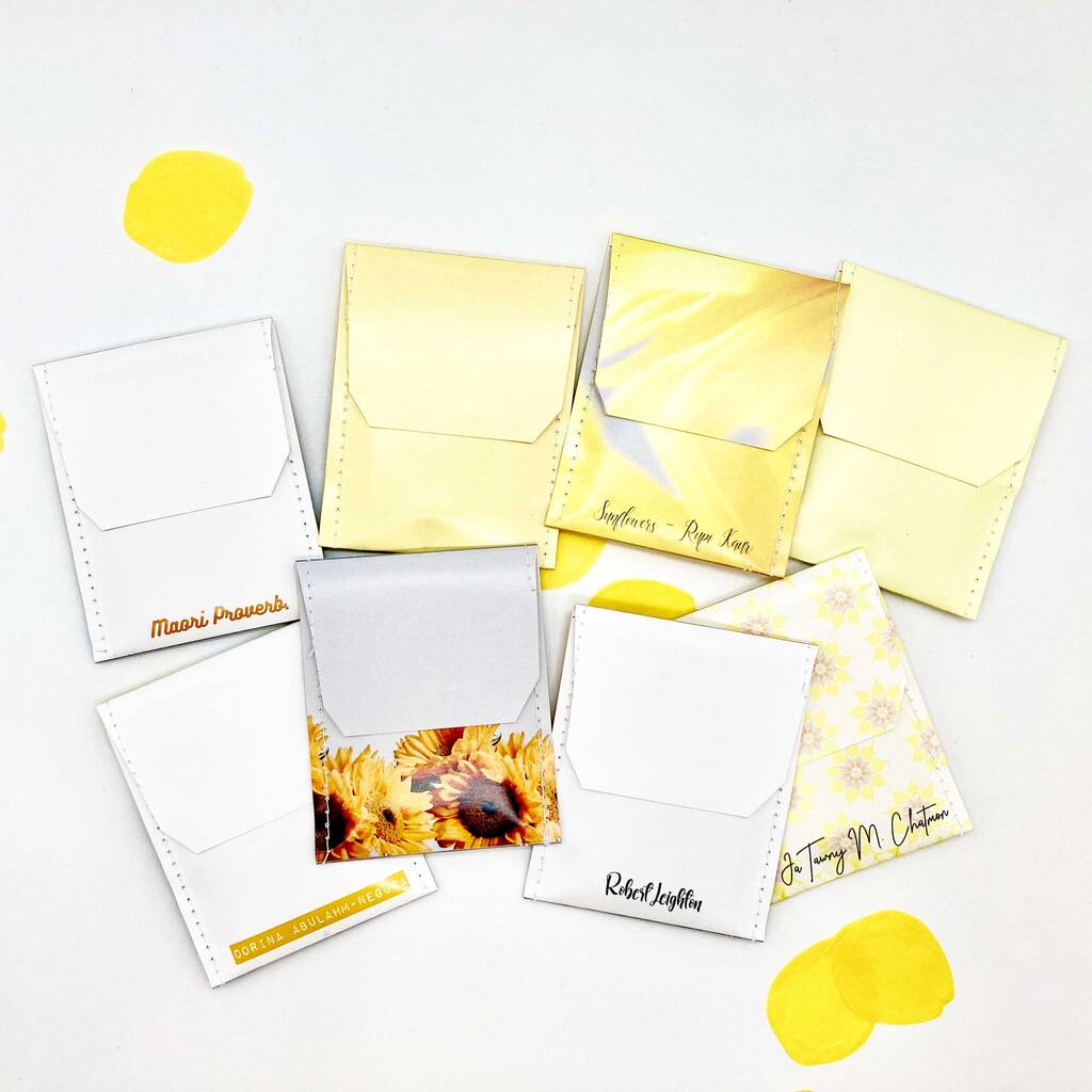 This gift features 8 individually wrapped in lovingly handcrafted sewn paper envelopes with inspirational quotes and bright vibrant designs of cheerful sunflowers.