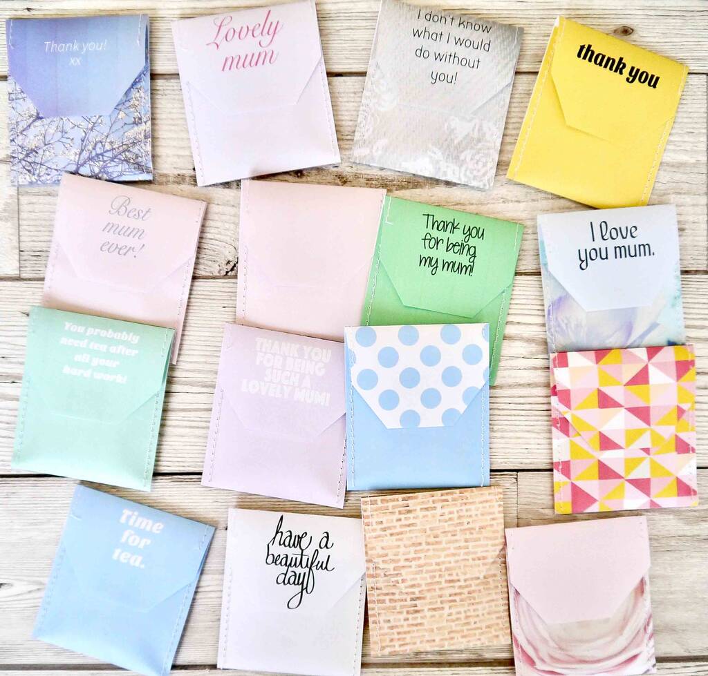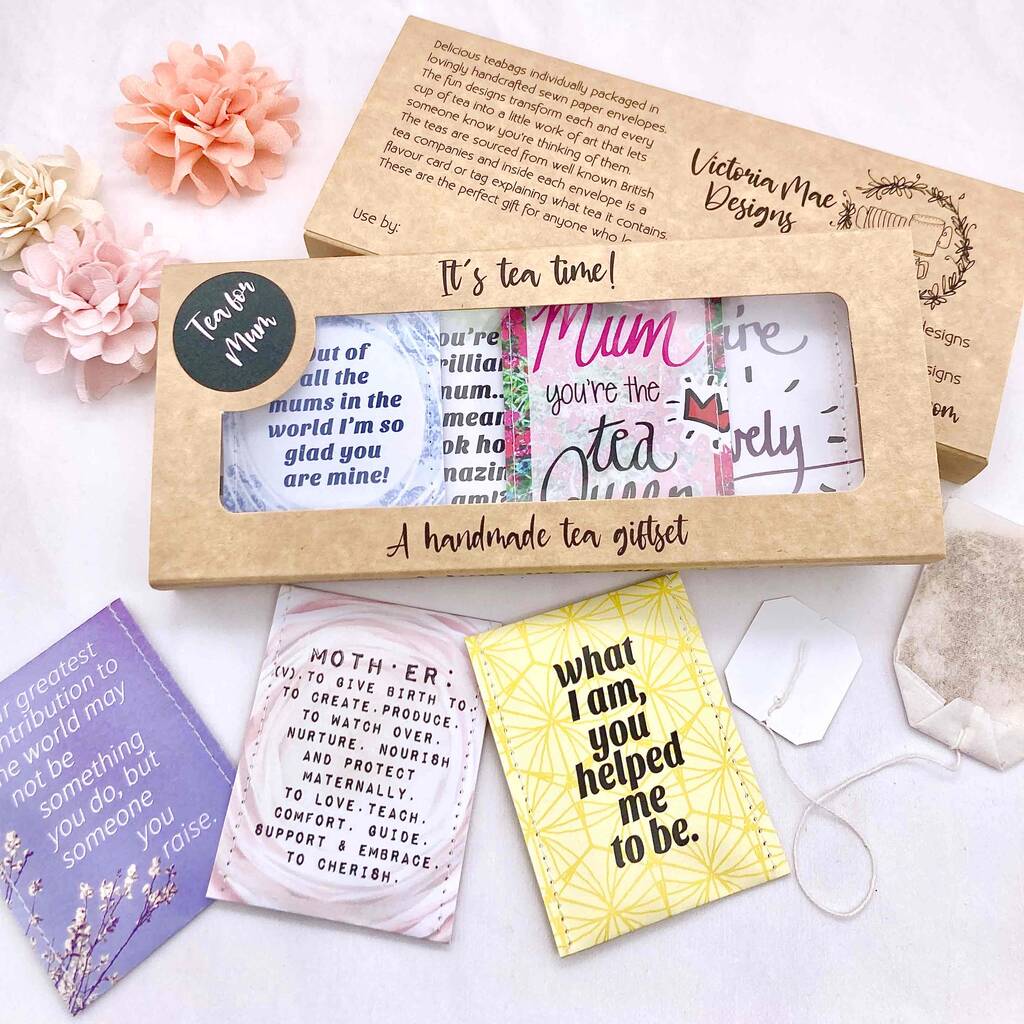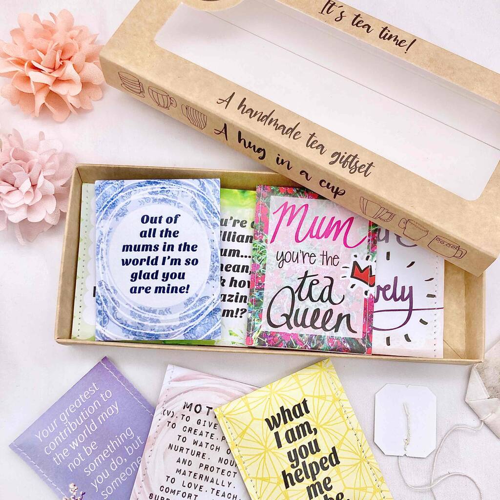 This gift is a set of 8 or 16 teabags packaged individually in handcrafted, sewn paper envelopes with thoughtful quotes for a special mum.