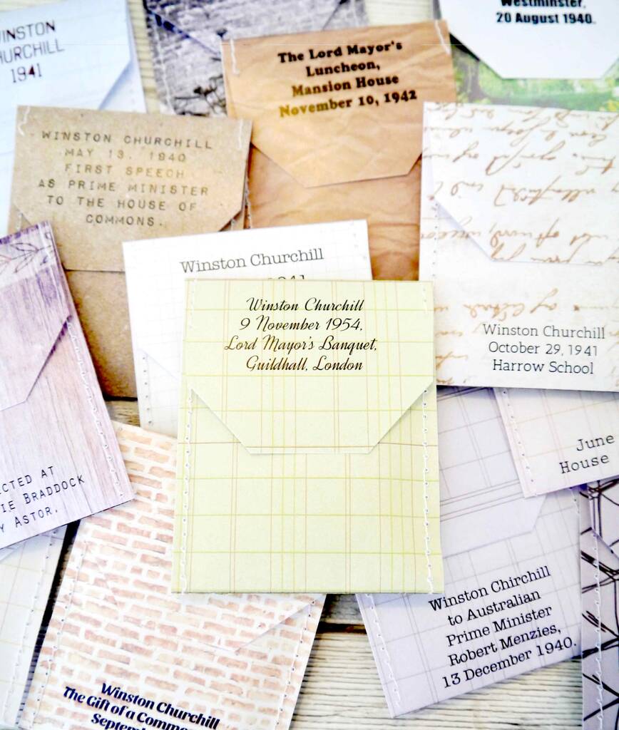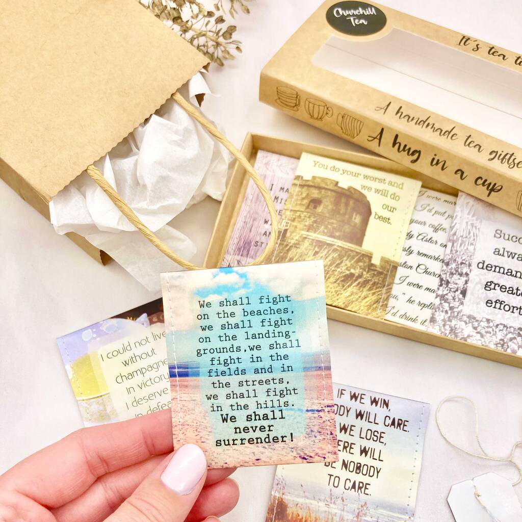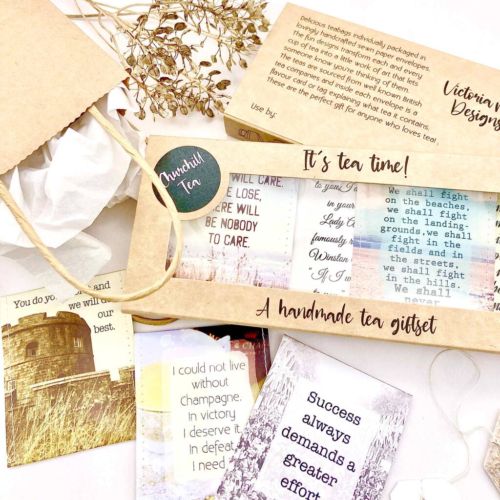 A pack of 8 or 16 teabags, individually wrapped in handmade, sewn paper envelopes featuring elegant vintage designs and iconic Churchill quotes.