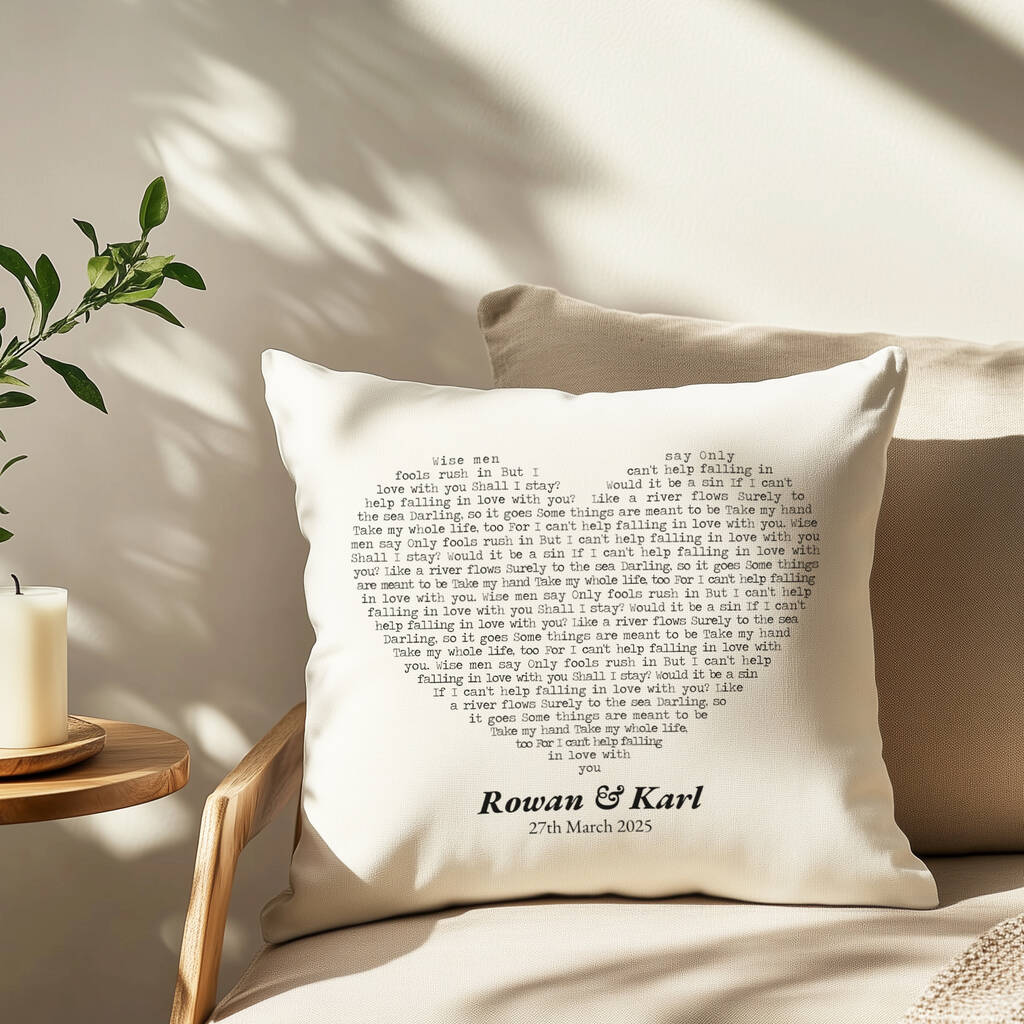 The Personalised Heart Lyrics cushion is an ideal wedding anniversary gift, commemorating a first dance or celebrating a friend's birthday with their favourite song.
