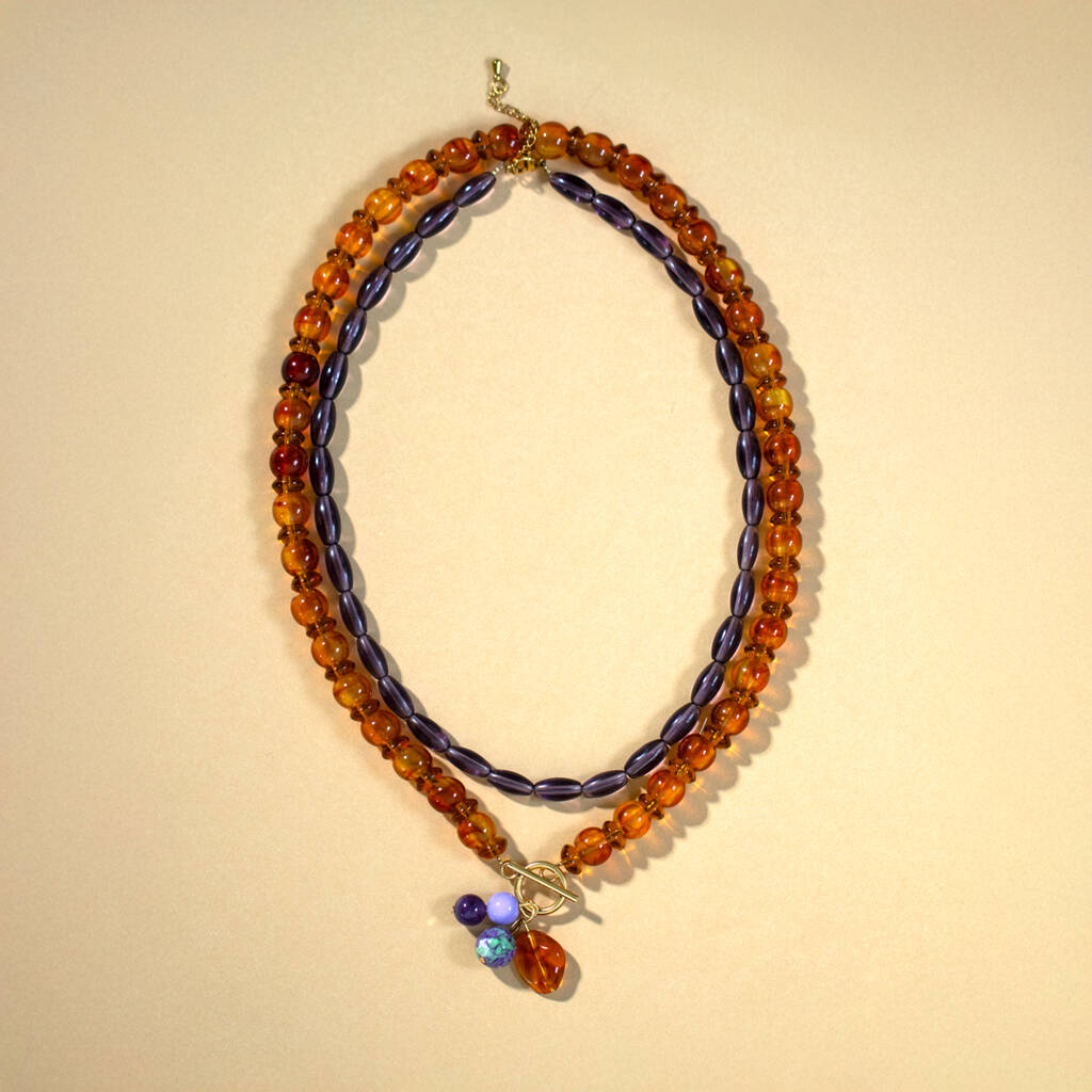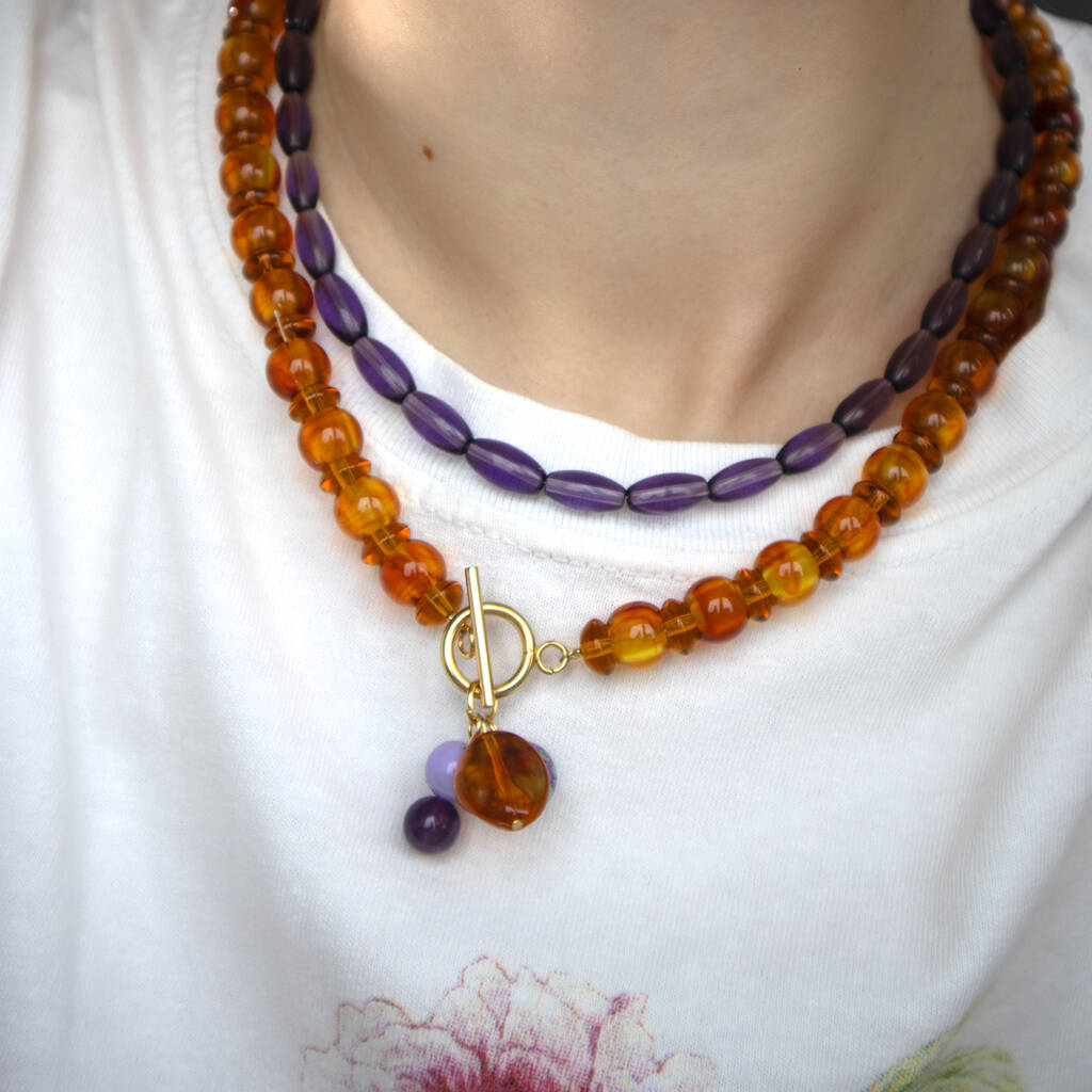Amber And Purple Bead Necklace With Charms Set Of Two
