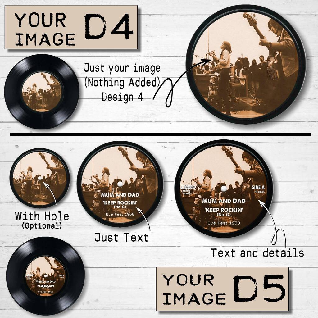 Simply choose from the 3 templates and a choice of many colours colours. Designs 4 & 5 are for your own image (which you are able to download once your order has been placed). Design 4 is 'just your image/pic' as you send it. If you want detail on your pic, such as Artist, Song, Messages etc please choose Design 5. We can add or remove any detail from our template - just add note.