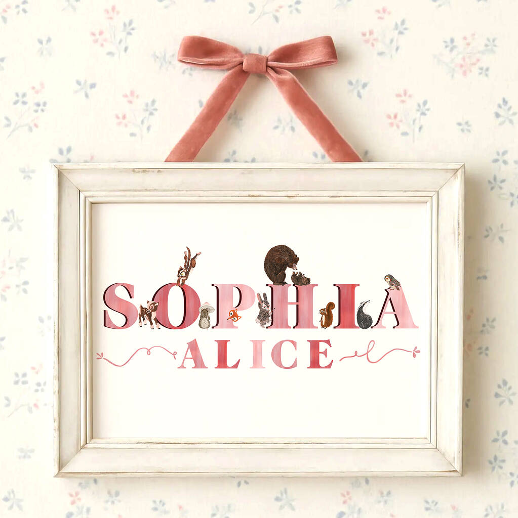 • Personalised Pink Woodland Animal Name Print, thumbnail 1 of 5