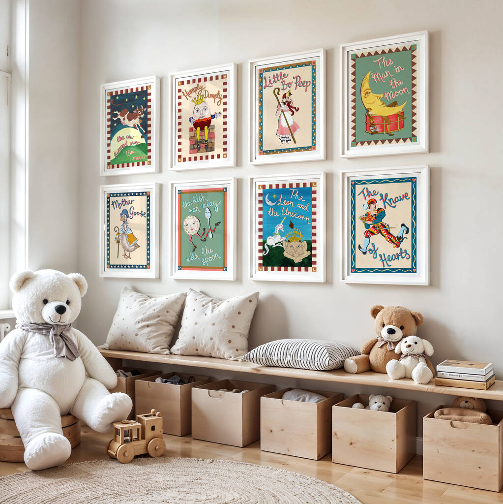Create a timeless storybook wall with our hand-painted vintage nursery rhyme prints — available as a customisable set of 2 to 8 enchanting designs.
