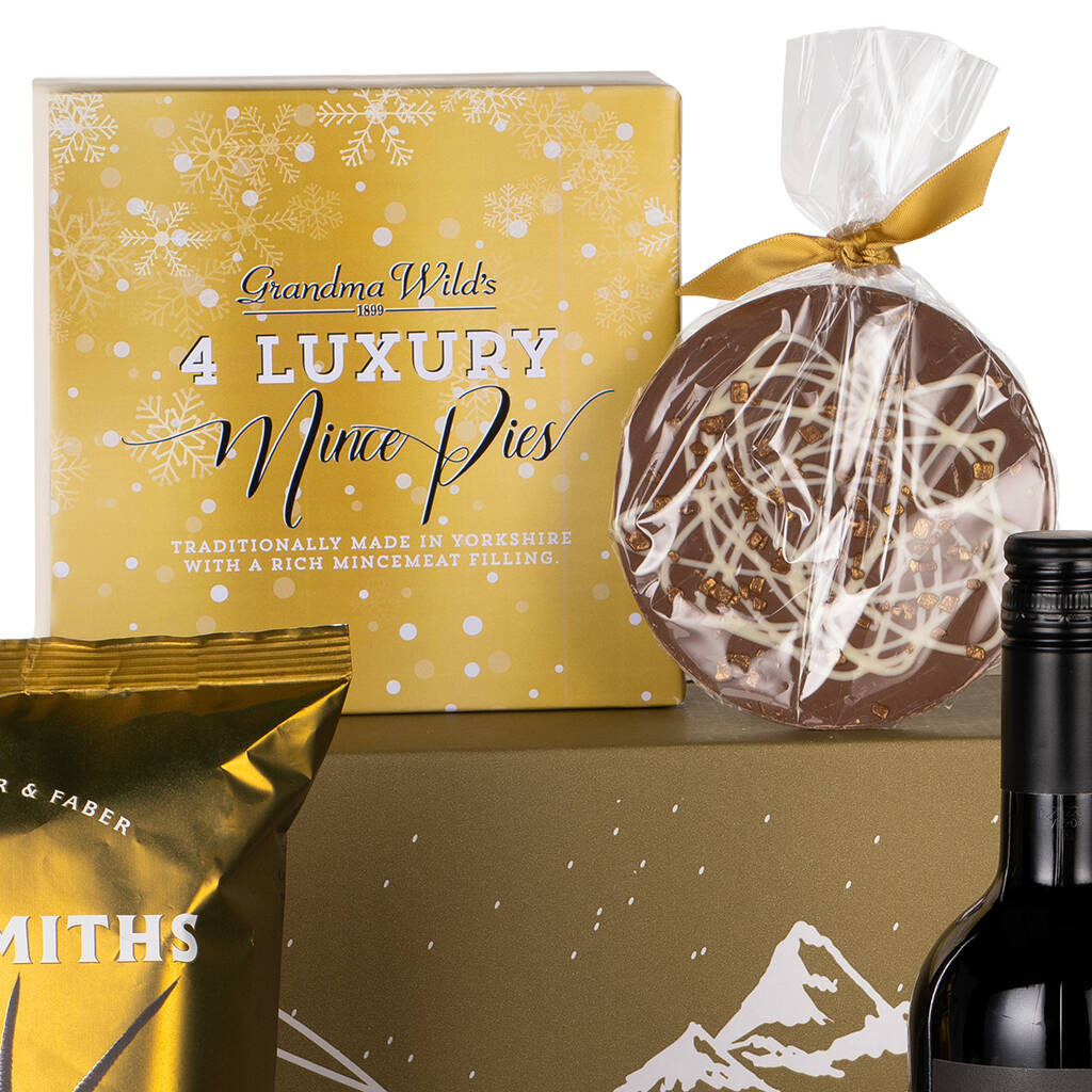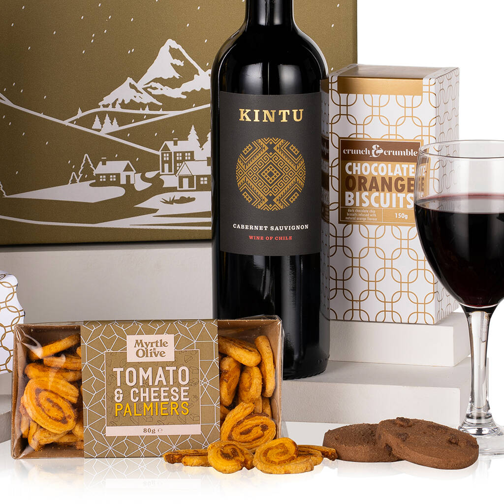 A radiant collection of festive favourites presented in a shimmering gold box, perfect for gifting to clients, friends, or loved ones. This beautifully curated selection of sweet and savoury delights promises to hit all the right notes this Christmas. Savour the richness of Kintu Cabernet Sauvignon, a smooth Chilean red wine with a bold character that pairs perfectly with festive fare. Tuck into the warming decadence of Grandma Wild’s Luxury Mince Pies, a timeless seasonal treat, and the crumbly goodness of Crunch & Crumble’s Chocolate Orange Biscuits, bursting with zesty charm. Satisfy savoury cravings with the delicate crunch of Myrtle & Olive Tomato & Cheese Palmiers and the refined flavour of Savoursmiths Desert Salt Crisps. A wonderful way to show appreciation and spread holiday cheer.