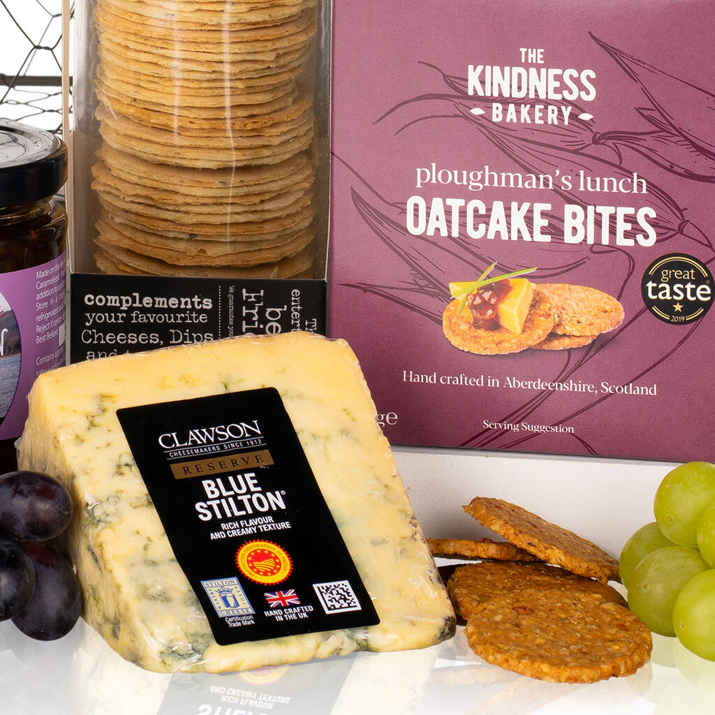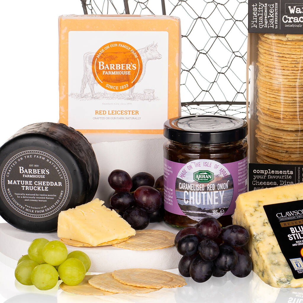 Presented in a charming wire mesh oval basket, this gift is a warm and rustic celebration of savoury indulgence. Enjoy three classic cheeses: Barber’s Farmhouse Mature Cheddar and Red Leicester, alongside the creamy depth of Long Clawson’s Blue Stilton. These British favourites are ready to be paired with a generous helping of Arran’s caramelised red onion chutney for a sweet and savoury balance. For the ideal crunch, dive into The Kindness Bakery’s Ploughman's Lunch Oatcake Bites and Olina's cracked pepper wafer crackers—crafted to complement every bite of cheese. Whether for family, friends, or colleagues, this hamper delivers comfort, flavour, and festive flair in every mouthful—making it a standout gift this Christmas.