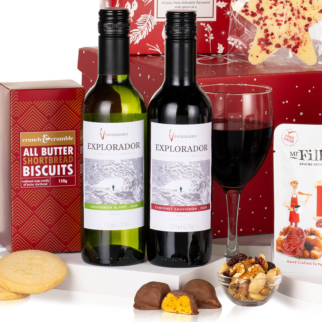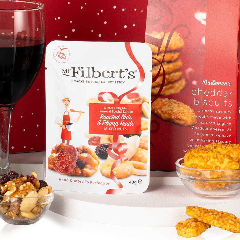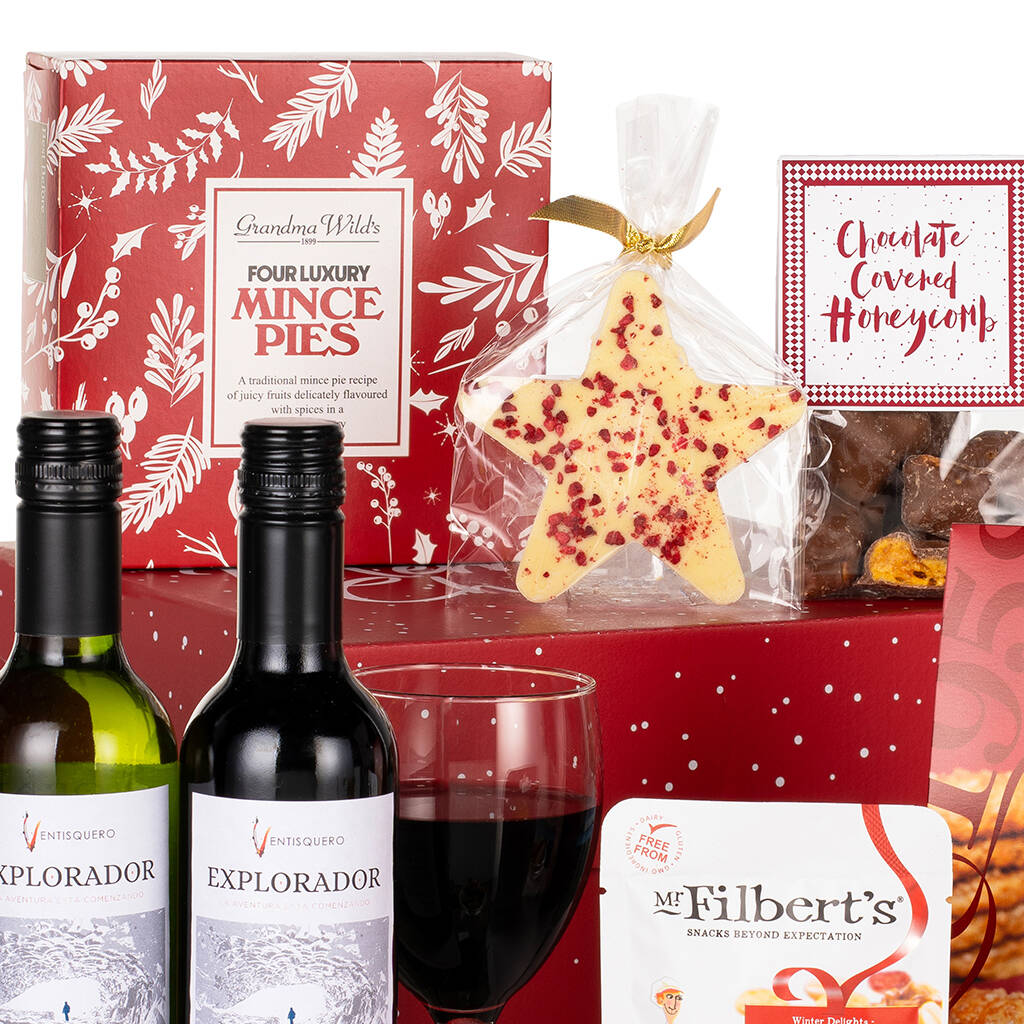 Presented in an elegant hinged box, this hamper combines traditional treats with gourmet flair to create a memorable holiday experience. Savour the classic charm of Grandma Wild’s luxury mince pies, perfectly complemented by the rich indulgence of Clarence & Bean chocolate-covered honeycomb and a delicate white chocolate star adorned with raspberry pieces. Enjoy the satisfying crunch of Mr Filbert’s roasted nuts and plump fruits mix alongside buttery Crunch & Crumble shortbread biscuits. Perfect for sending joy to friends and family during the festive season.