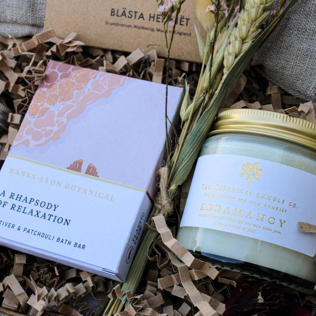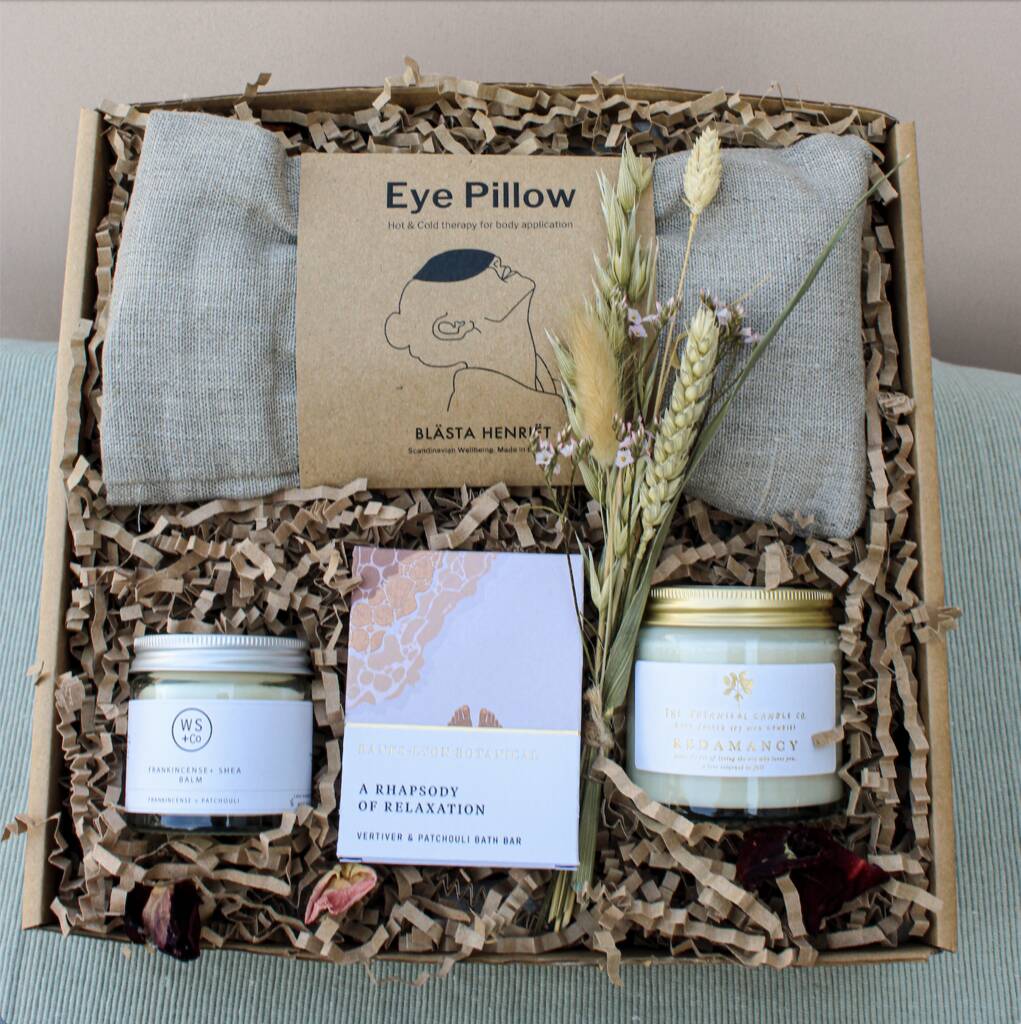 Give the gift of complete relaxation with the carefully curated Total Timeout Gift Box featuring an eye pillow, hydrating body butter and hand-poured soy candle.Give the gift of relaxation with Total Timeout, a carefully curated selection of products designed to help anyone pause and reset. Start with the beautifully versatile eye pillow, perfect for soothing tired eyes, and blocking out light. This eye pillow can also be heated to act as a warm compress to relieve and ease aches and pains. For skin nourishment, enjoy the rich hydration of our whipped body butter, formulated to deeply moisturise, infused with grounding Frankincense and Patchouli essential oils. Crafted with the finest ingredients and housed in an amber jar, our hand-poured soy wax candle completes the experience.