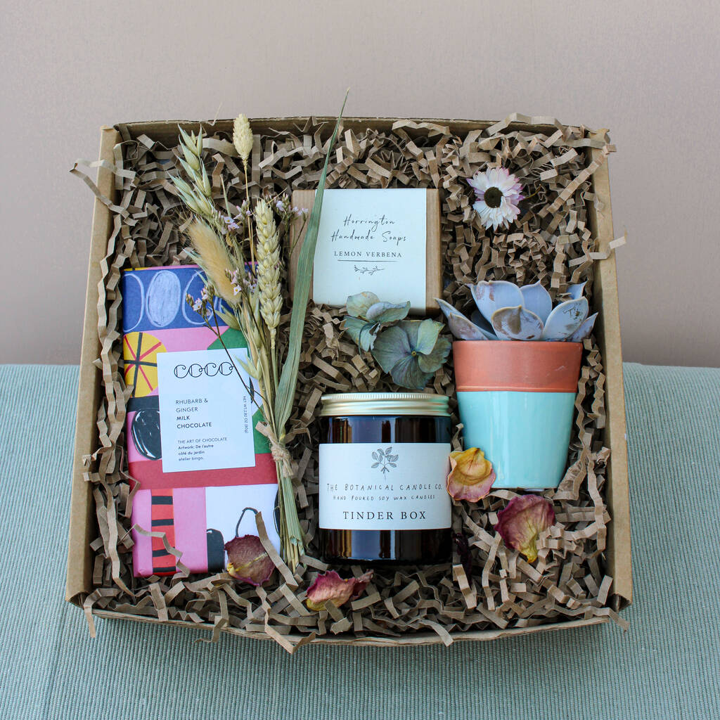Our gift boxes are made from FSC certified cardboard, use compostable, dissolvable packaging chips, and recycled shredded brown paper.