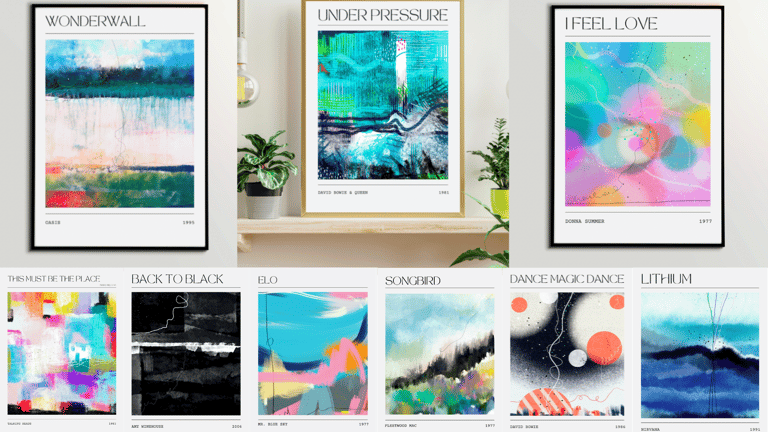 I started making marks to the duration of songs initially and was quite surprised to find myself seeing colours in the music, the mood, the emotion and the lyrics flowed and before I realised I could get through a whole tune without crying. This soon turned into a series of unique art prints, cards & tees.