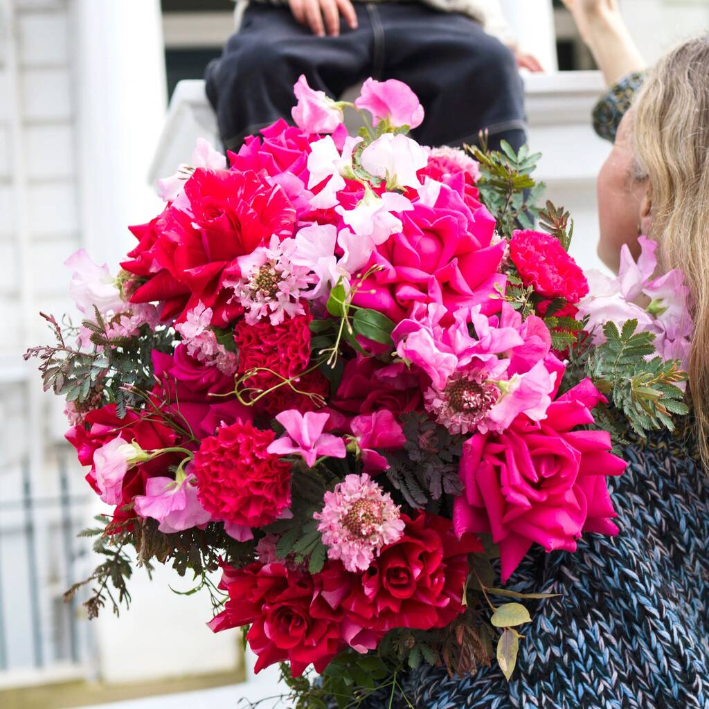 A sumptuous composition of Pink Floyd and Pink Pumia roses, Royal Blush spray roses, hot pink scabious, sweet peas and ruffled carnations.