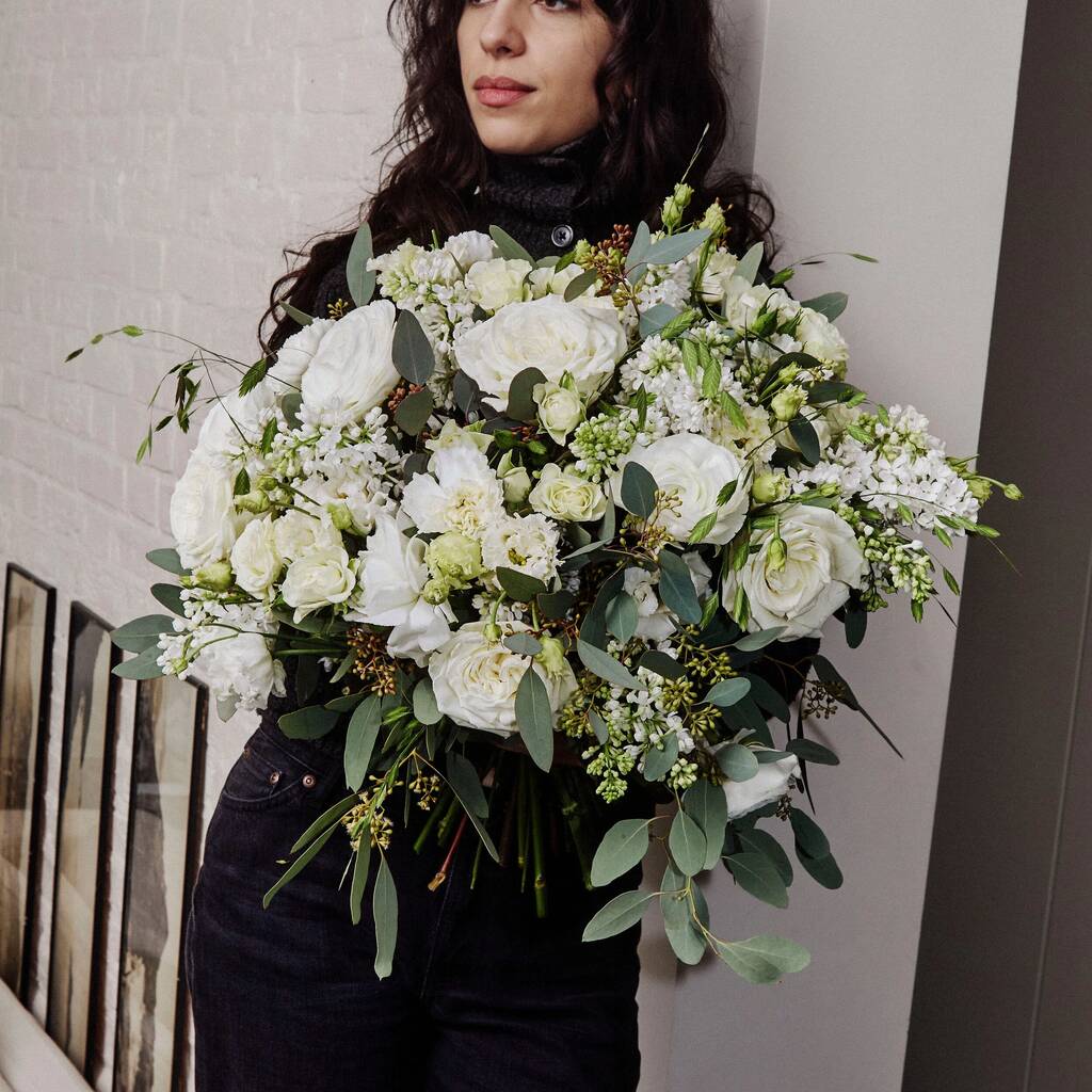 Pure Love pairs roses, ranunculus and lisianthus with soft astilbe, astrantia and grasses in pristine white tones. An angelic expression of devotion, purity and romance.