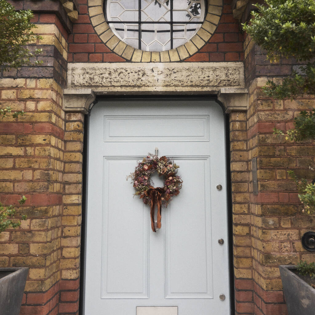 This wreath includes sedum heads, heather, vibrant pink helichrysum, bronze fern leaves, pink dahlias, bracken, mauve hydrangea and much more.