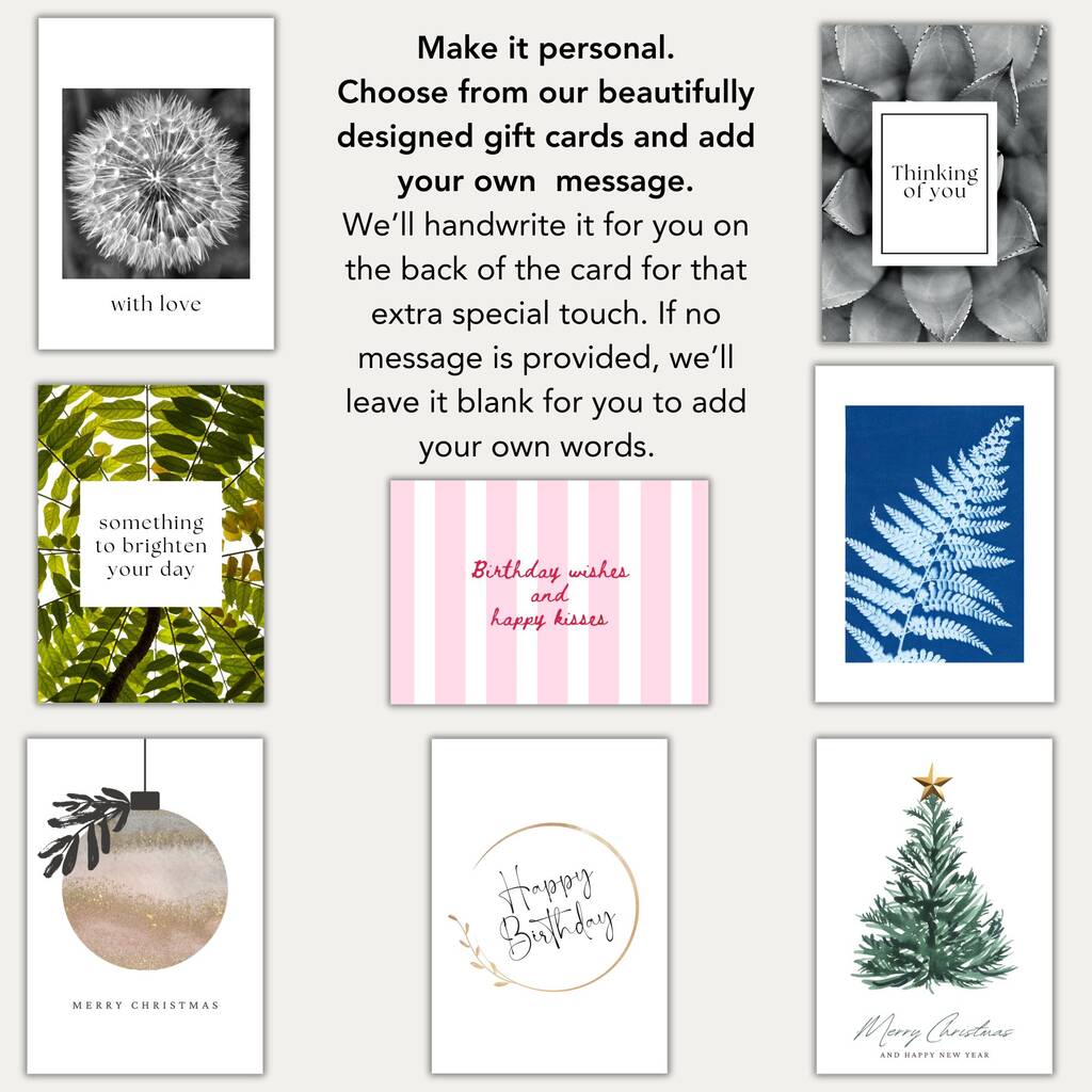 Customise your gift and select from our range of beautiful postcard size gift cards thoughtfully designed to add a personal touch. We will hand write your message on the back of the card. Choose from our diverse selection of designs available in the convenient drop down menu, making your gift giving process effortless.