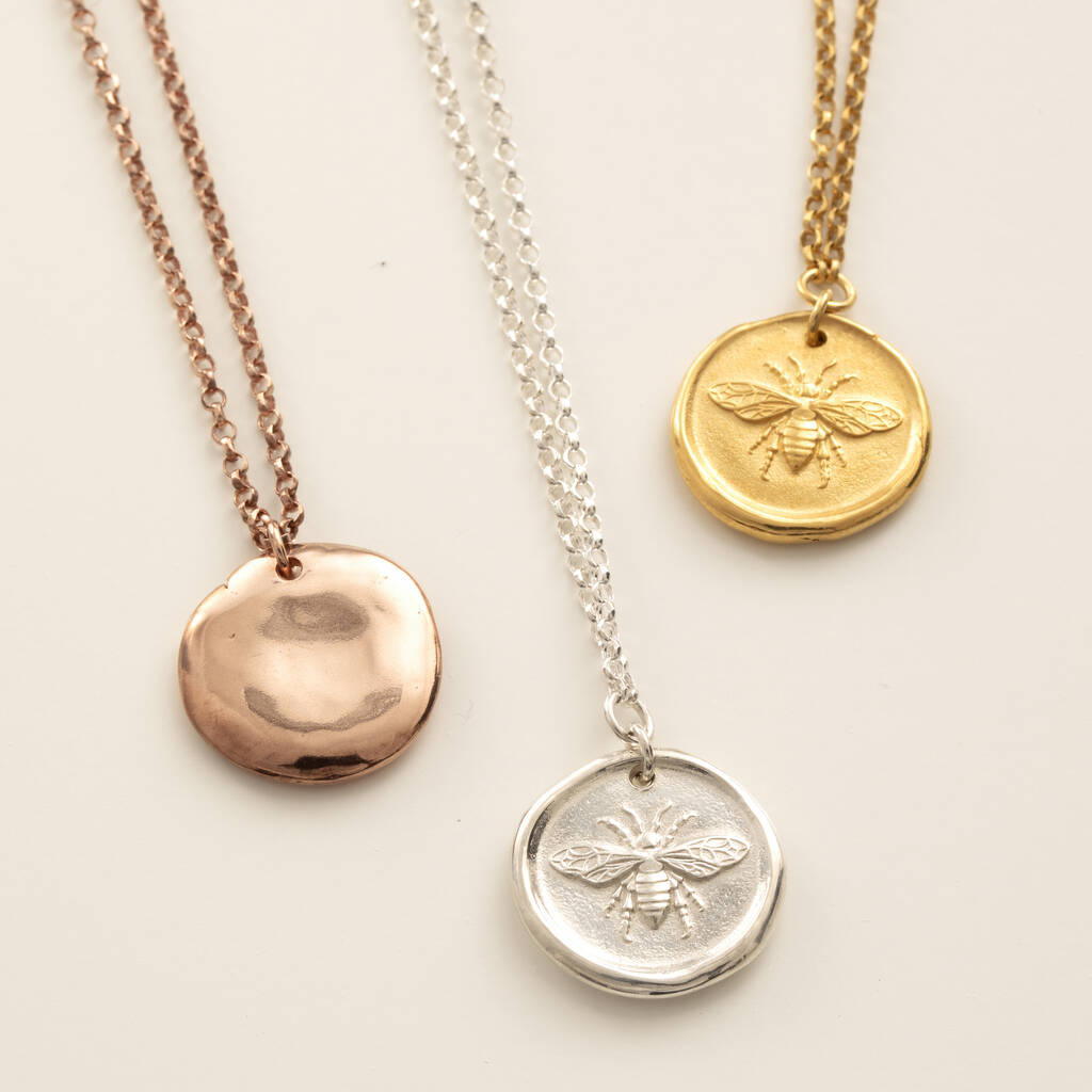 Wonderfully tactile sterling silver or gold honey bee/worker bee relief pendants hanging from a pretty oval belcher chain. Offically hallmarked by the London Assay Office.