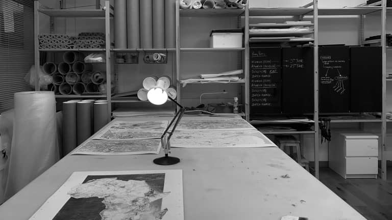 The print-work is heavily influenced by architectural drawing conventions, using gridlines, hatching and scalebars to create unique and interesting compositions. Each print is hand-finished using 24ct gold leaf which is applied to the surface of the print using a specialist glue which is also painted on to each piece by hand. The way the gold adheres to the print is different every time, rendering each composition unique - each time picking up different parts of the slightly textured german etching paper onto which the design is printed.