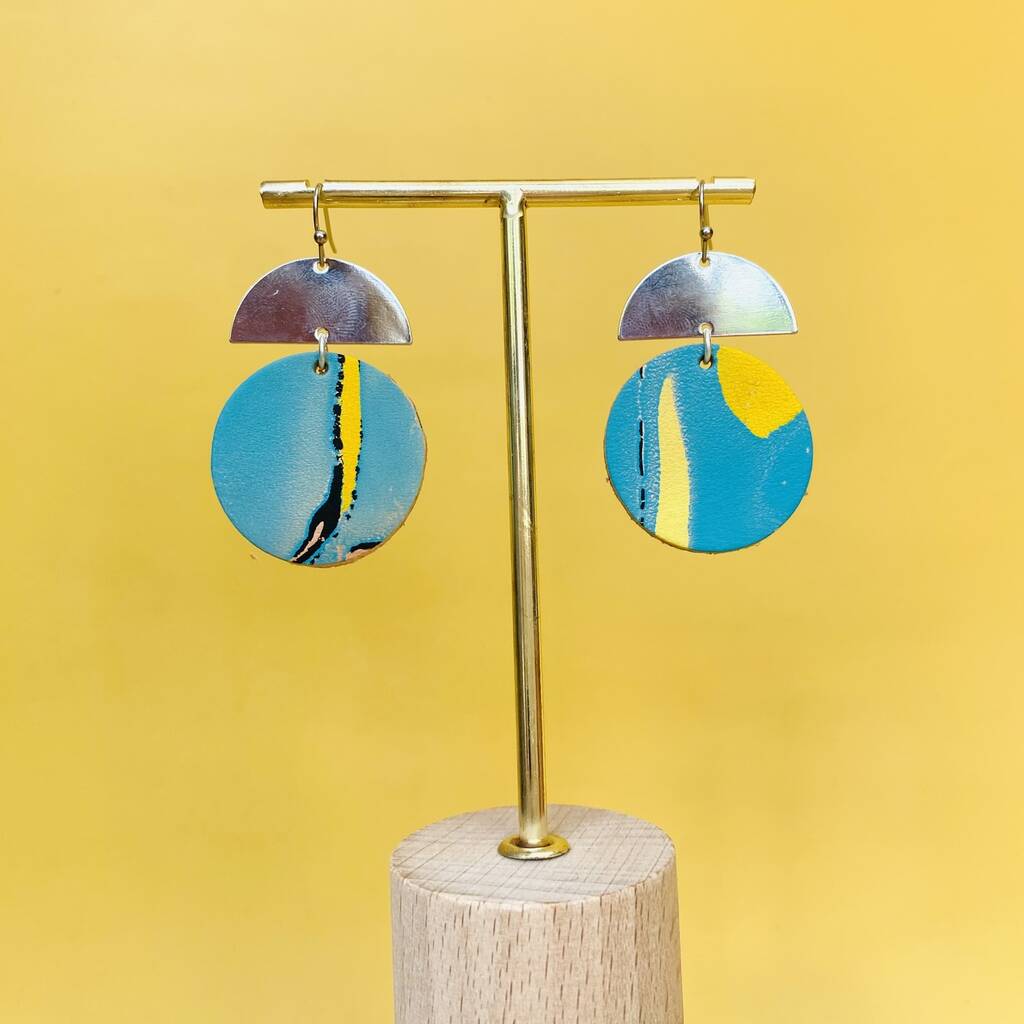 Handmade Leather Large Full Moon Dangly Earrings Marbled