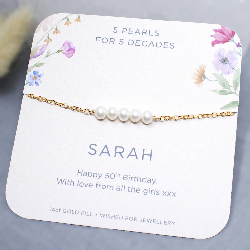 50th Birthday Pearl Bracelet 14ct Gold Fill With Personalised Card