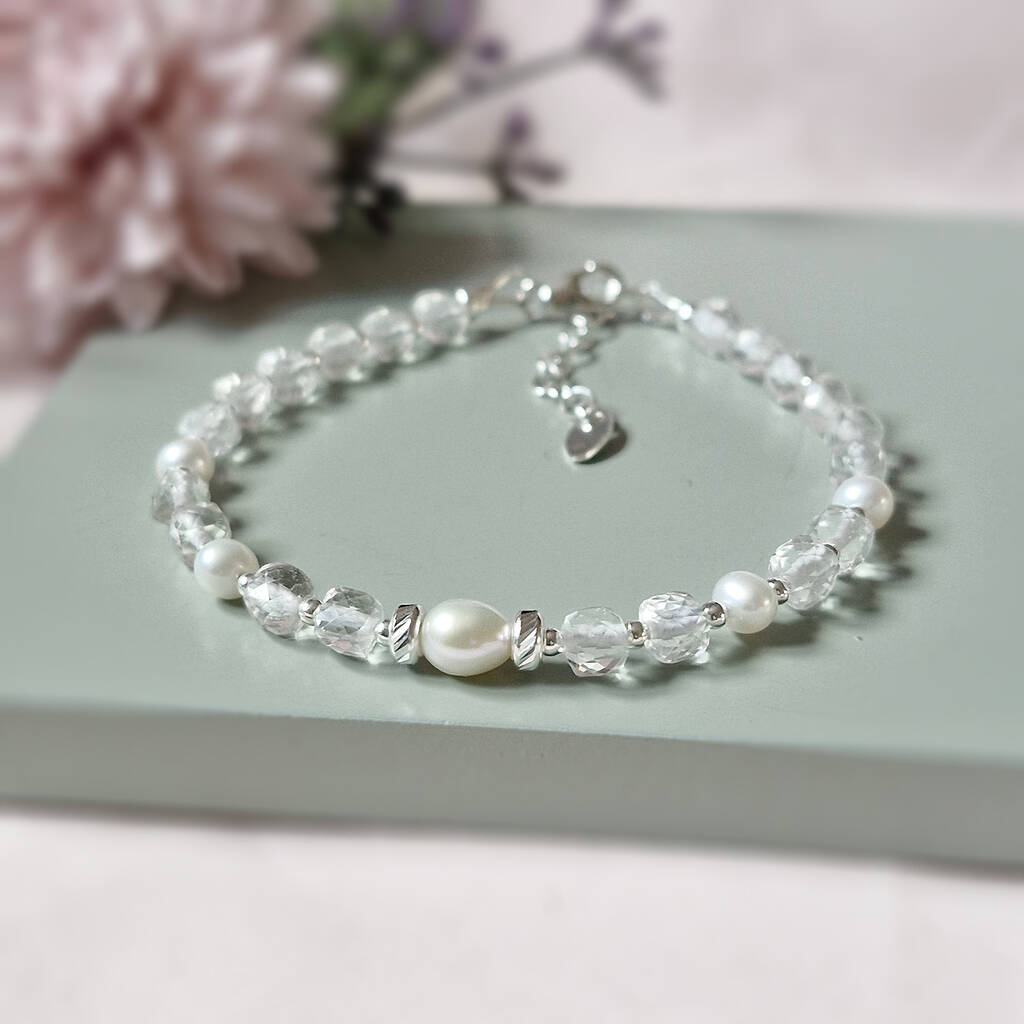 Gorgeous sparkling clear Quartz gemstone bracelet with freshwater pearls and 925 sterling silver, ideal as an April birthstone gift for her.