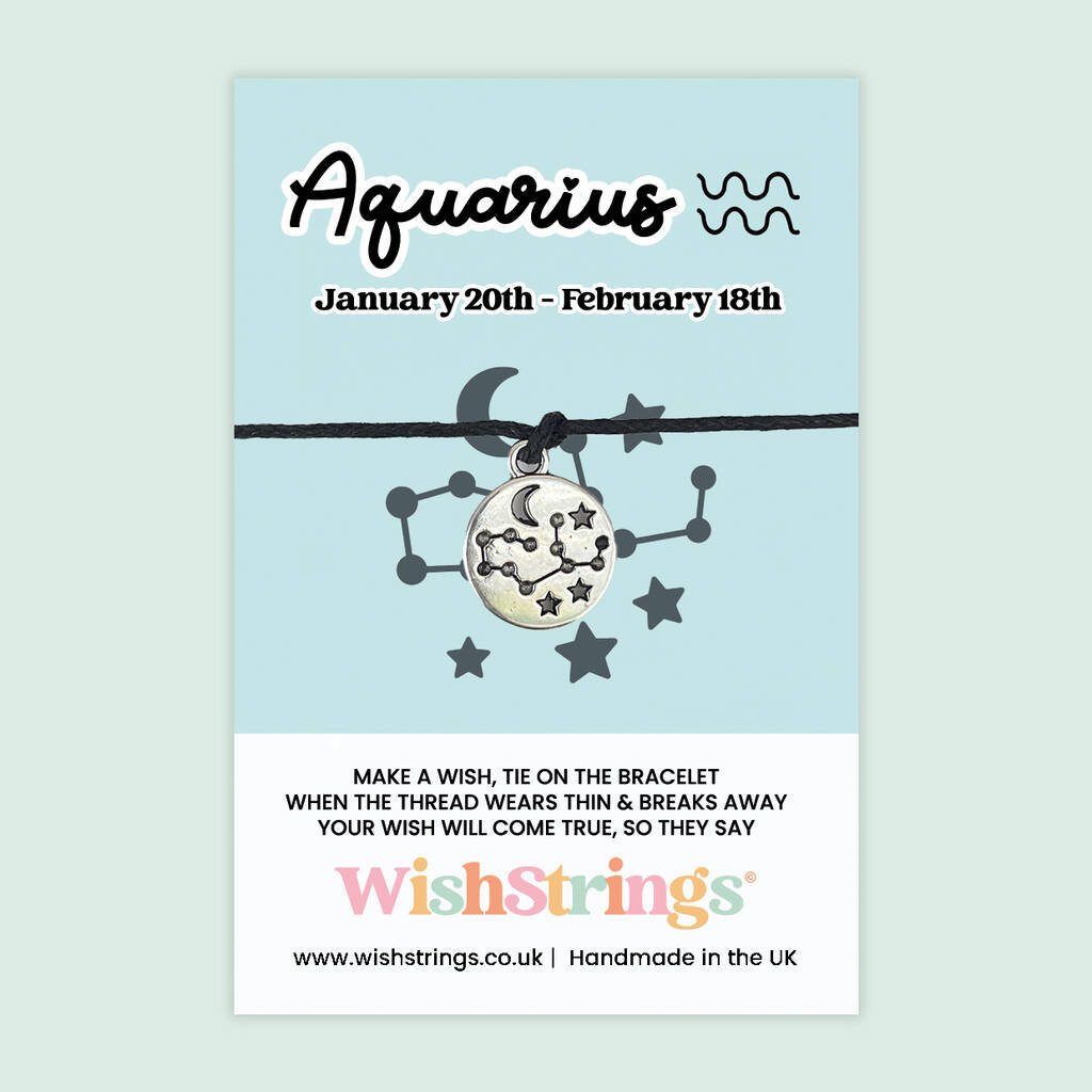 A meaningful Aquarius Wish Bracelet featuring a celestial charm, perfect for star sign lovers who adore thoughtful, symbolic gifts full of intention and magicCelebrate the unique spirit of Aquarius with this enchanting WishStrings Wish Bracelet. Featuring a celestial zodiac charm on an adjustable thread, it’s a thoughtful keepsake for birthdays, horoscope lovers, or anyone who resonates with Aquarius traits. Simply tie the bracelet on, make a wish, and let it wear naturally—when it breaks, legend says your wish comes true. Handmade in the UK, this bracelet arrives on a beautifully illustrated zodiac card, making it a meaningful and easy-to-gift present for friends, loved ones, or yourself.