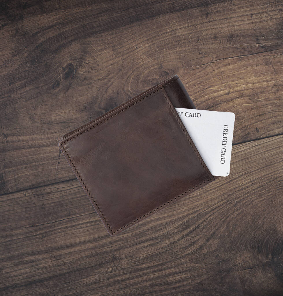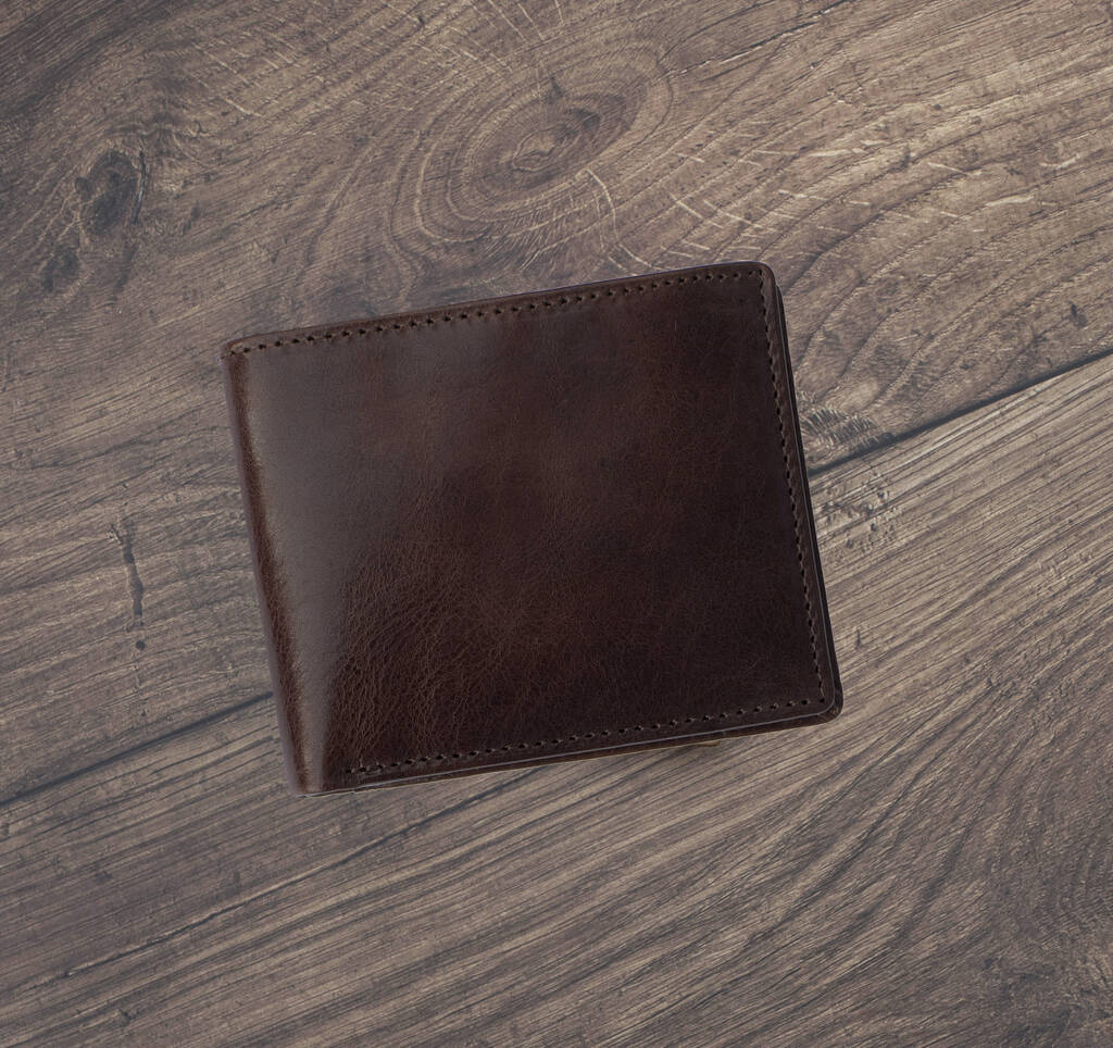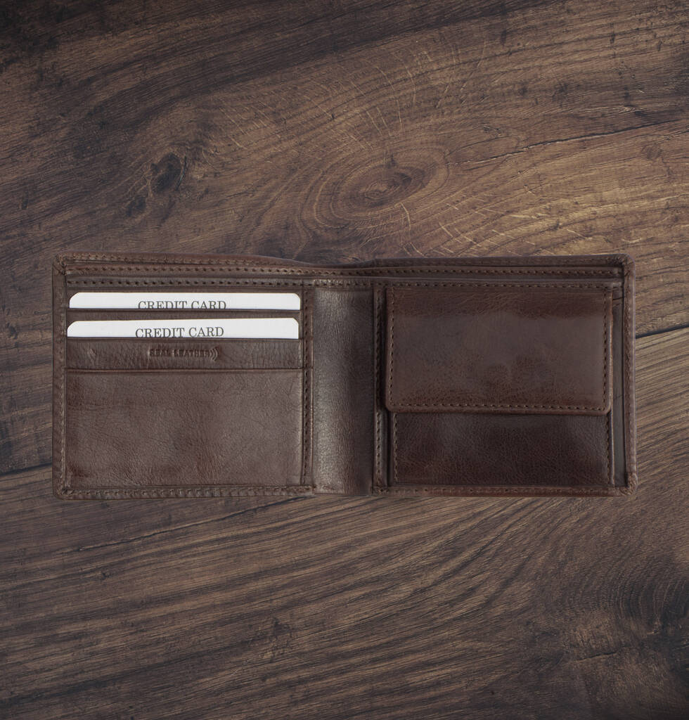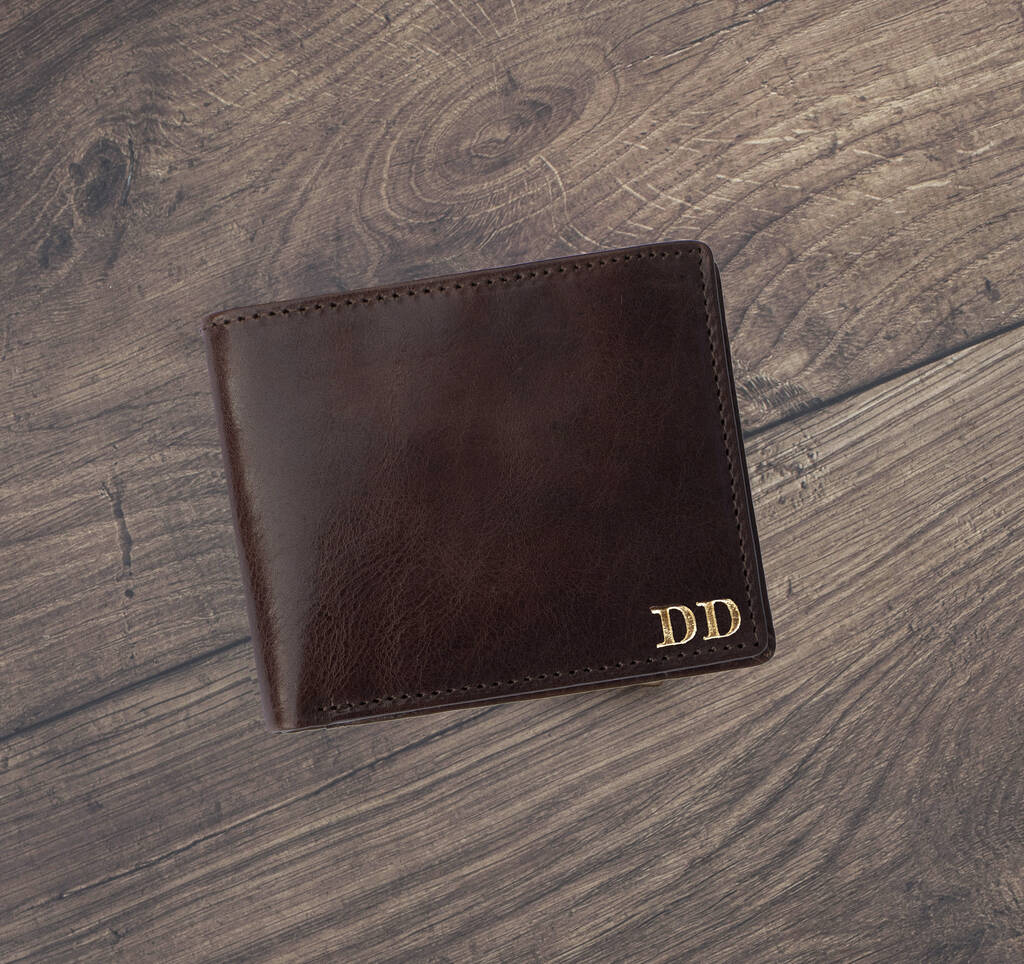 Personalised Luxury Leather wallet in Dark Brown Hide Leather with RFID Protection Woodland Collection.