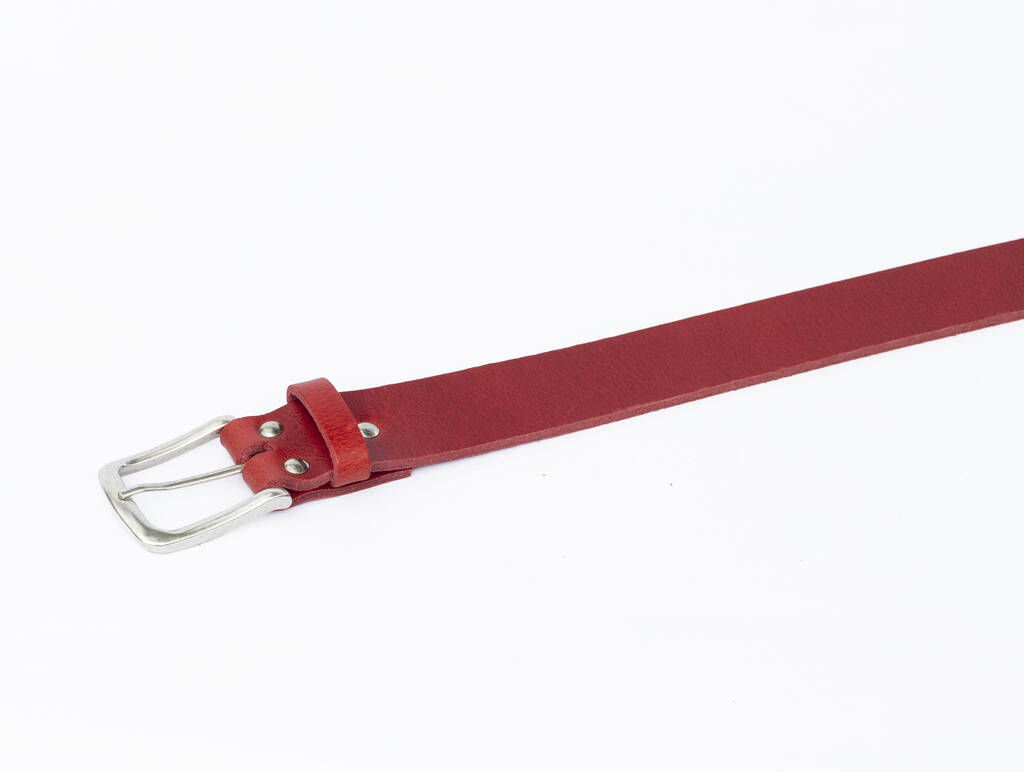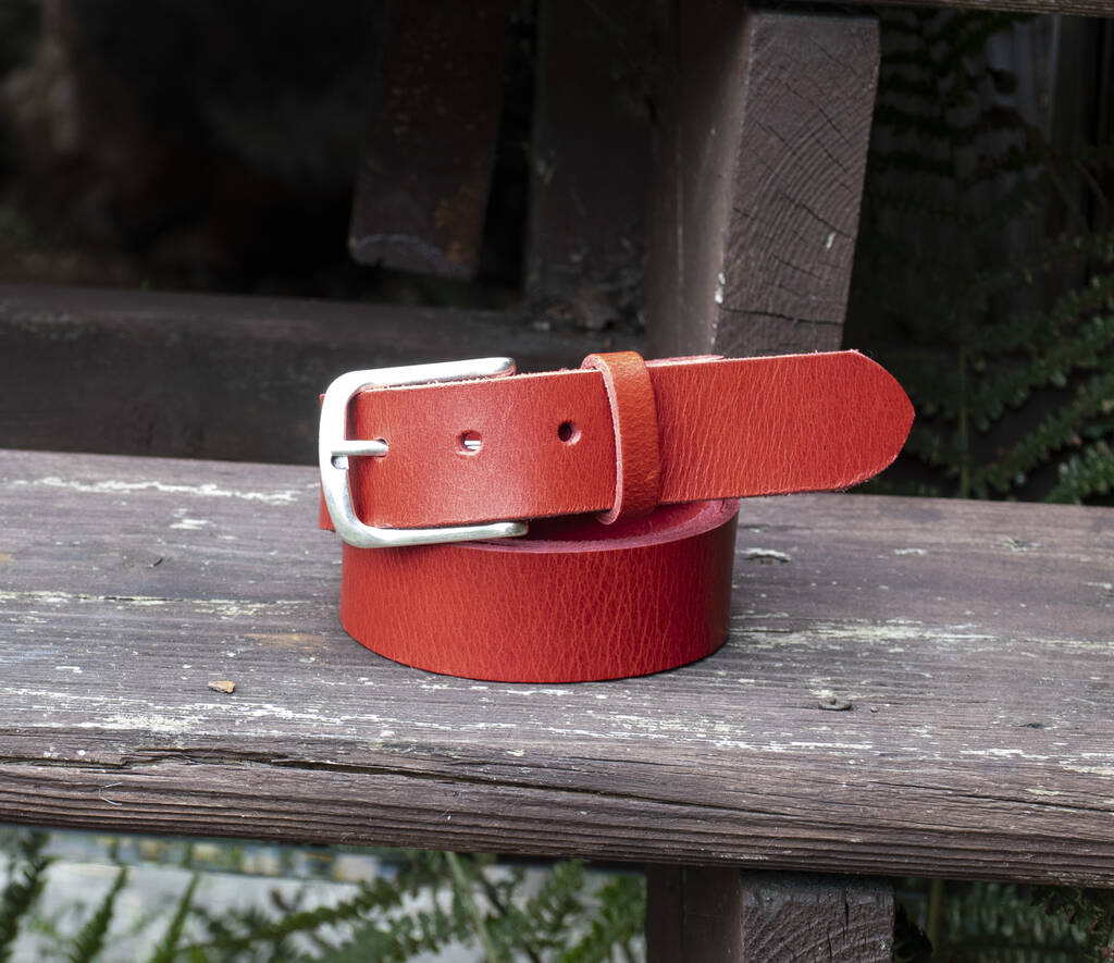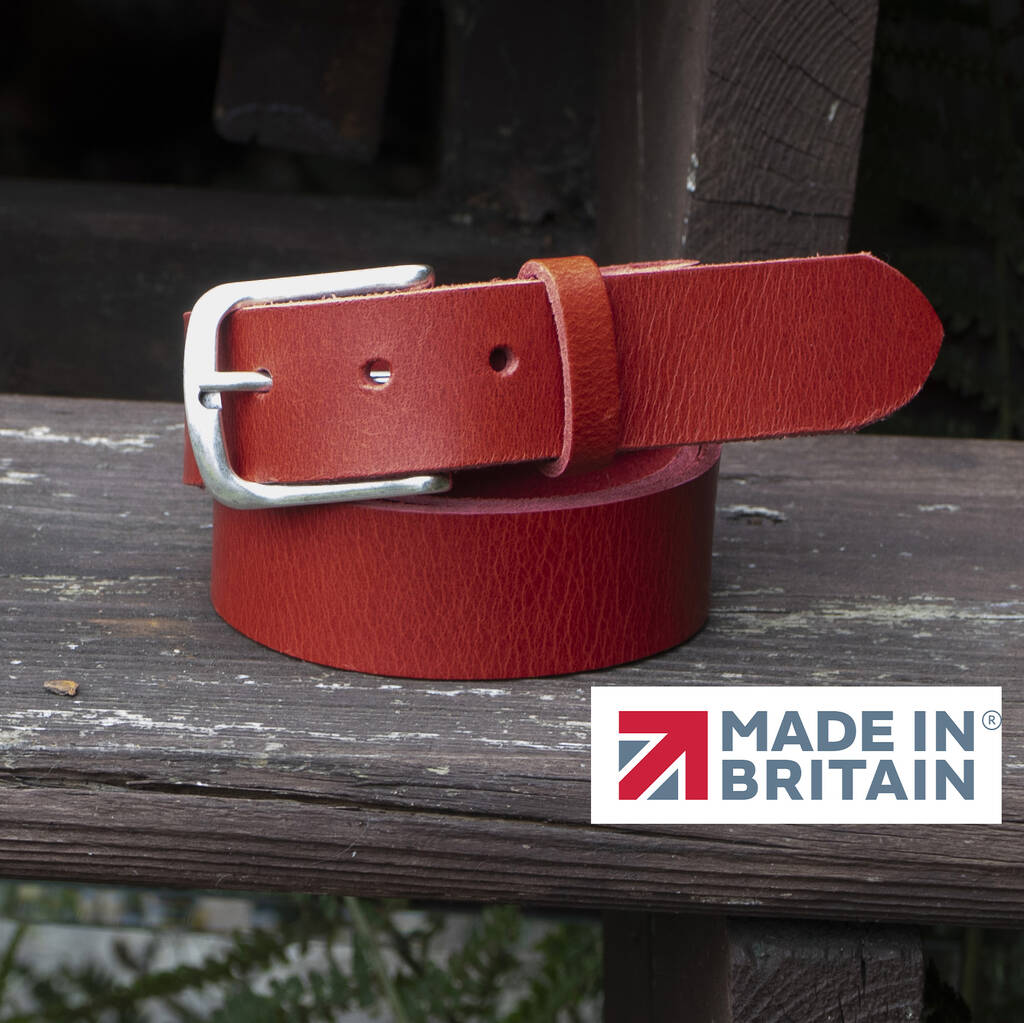 Handmade men’s red leather belt crafted in Britain from premium English hide. Durable & stylish – the perfect gift for him.