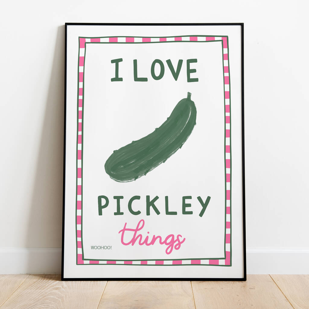 Add a touch of humour and personality to your walls with this fun “I Love Pickley Things” art print. Featuring hand-painted lettering, a playful pickle illustration, and a fresh striped green border, this print is perfect for kitchens, dining spaces, or anyone who appreciates quirky food-themed décor.