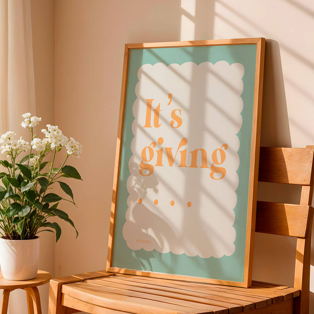 Make a statement with this playful and modern typography print featuring the phrase “It’s Giving…” in a soft orange hue, beautifully framed by an eye-catching aqua scalloped border. Designed to bring personality and charm to your space, this print strikes the perfect balance between contemporary style and light-hearted expression.