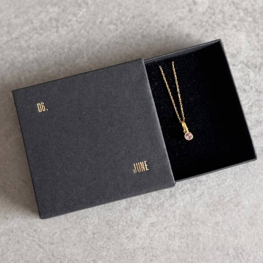 This personalised June birthstone necklace features an alexandrite Swarovski crystal symbolising transformation and balance - a meaningful jewellery gift crafted in 24k gold-plated sterling silver.