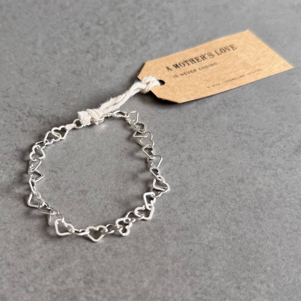 A beautiful sterling silver linked hearts bracelet designed to symbolise a mother’s love — constant, strong and never ending, a meaningful keepsake to treasure.