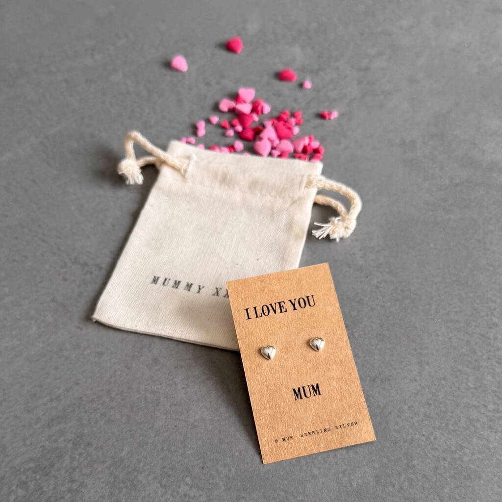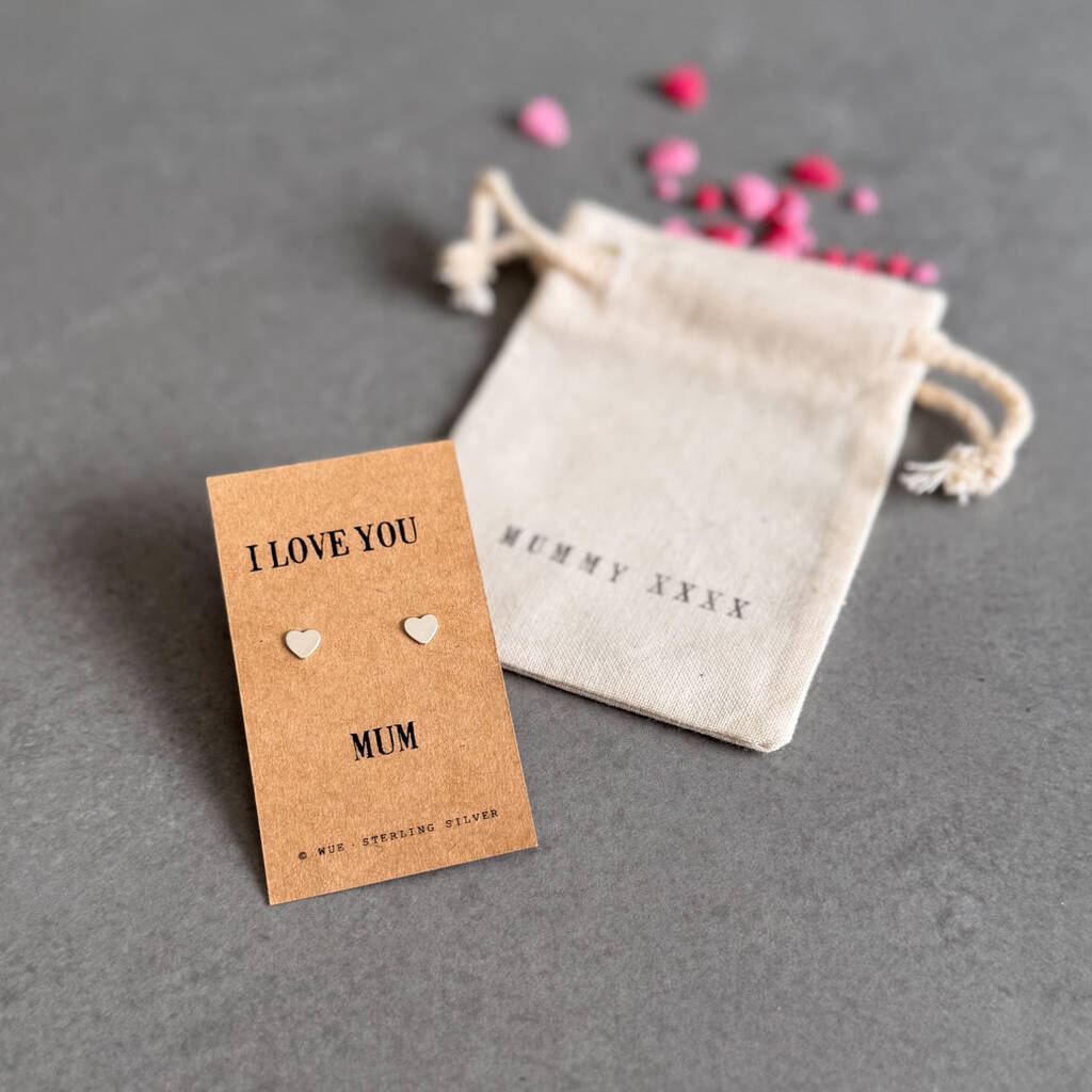 'I Love You Mum' sterling silver earrings with optional personalised gift bag.