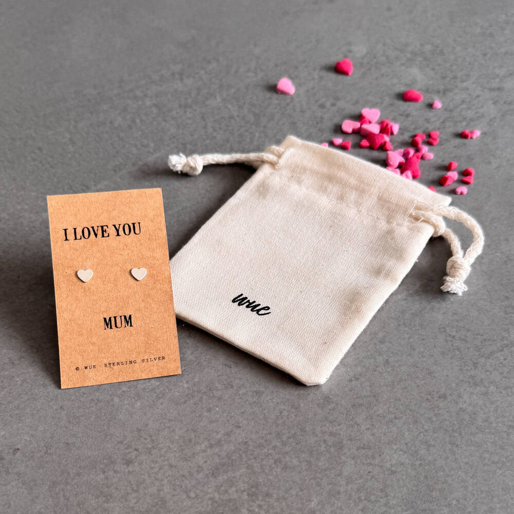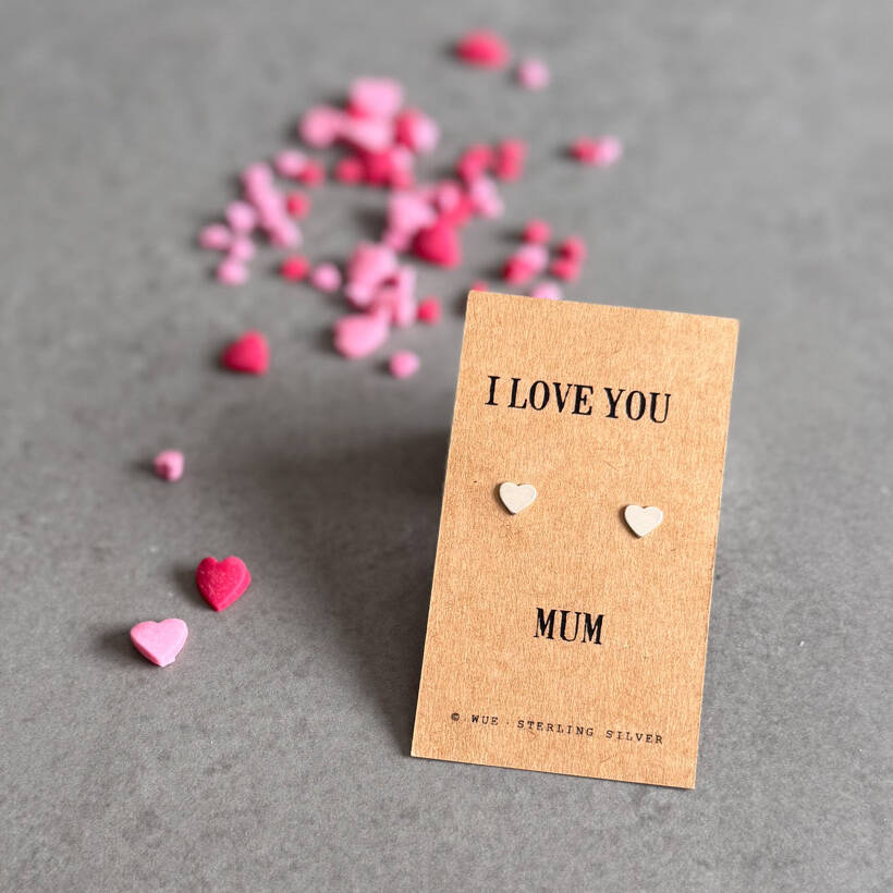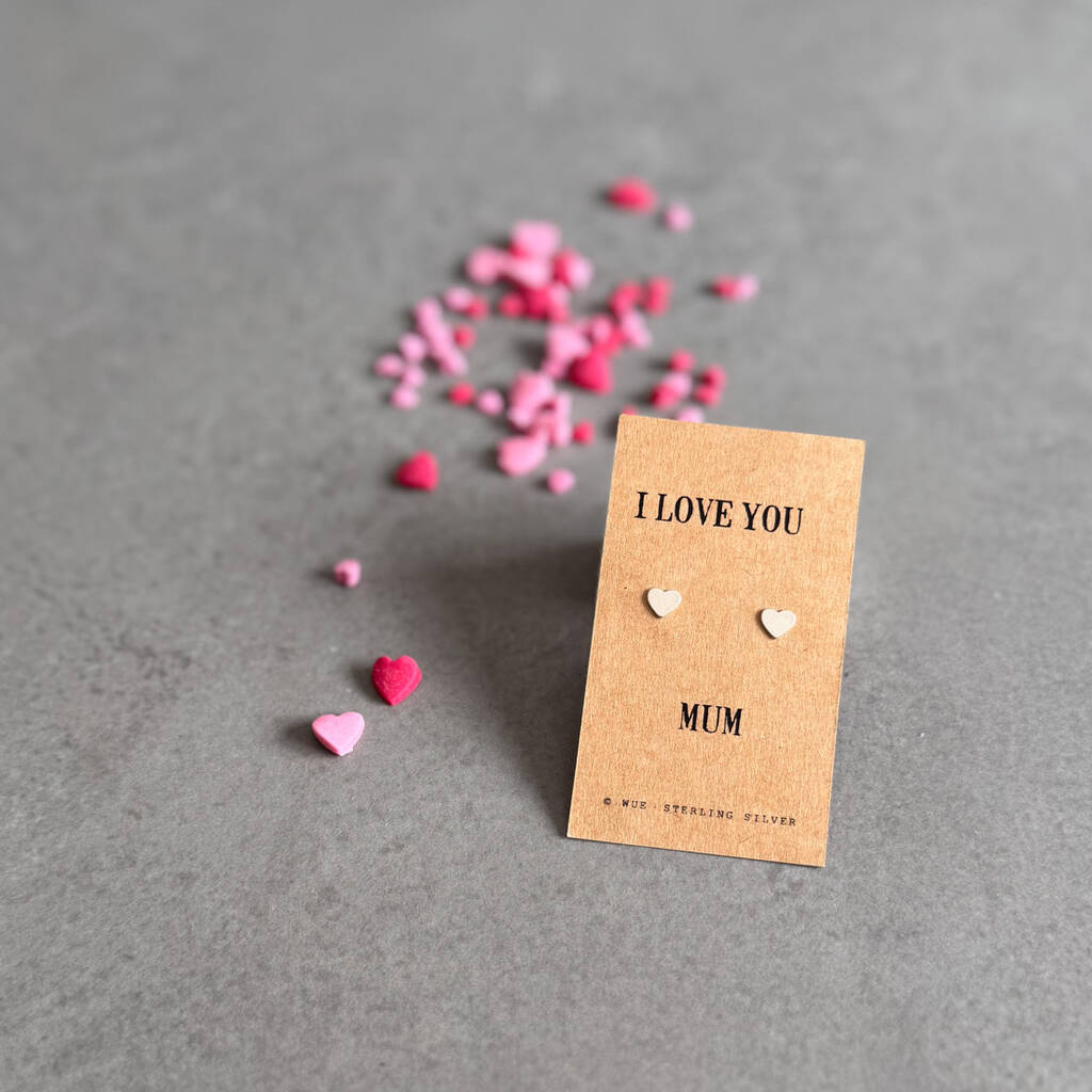 'I Love You Mum' sterling silver earrings with a little message card from Wue's token earrings range.